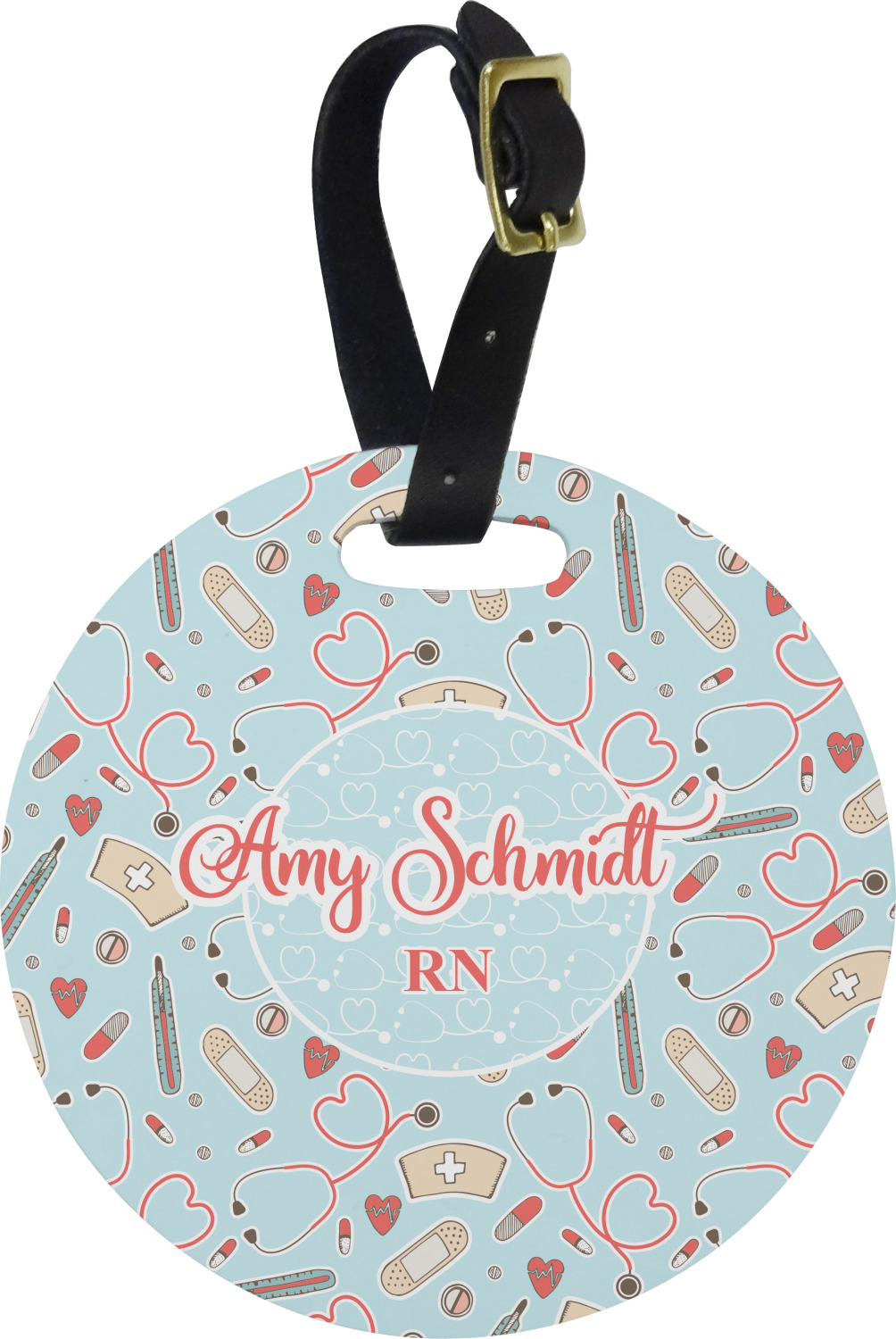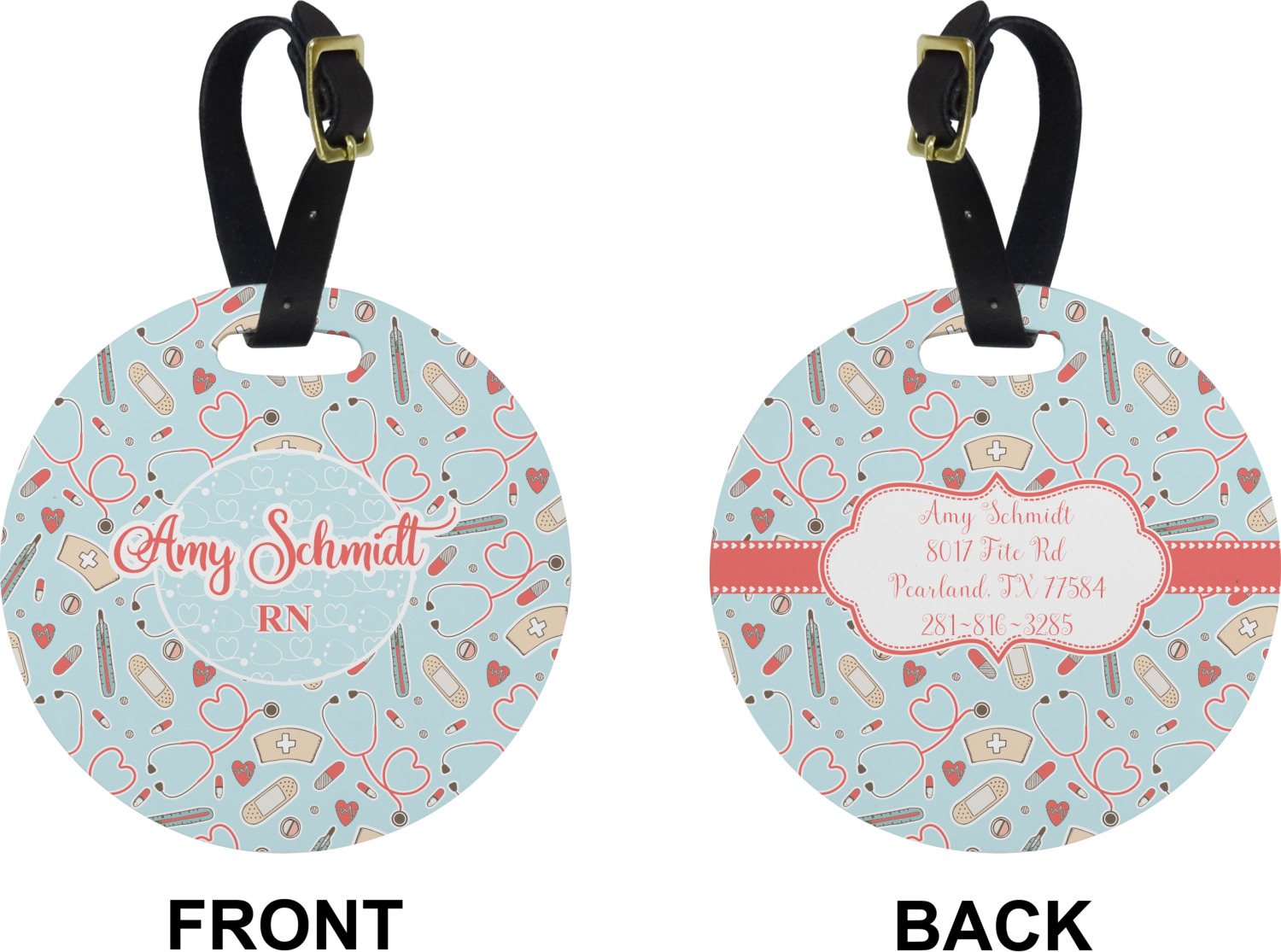 These personalized bag tags are sold in a variety of shapes, so that you may find the product that meets your vision exactly. We sell a round luggage tag, which measures at approximately 4" x 4". Our square luggage tag is about 3.5" x 3.5", while our rectangular version is 2.75" x 4 ".