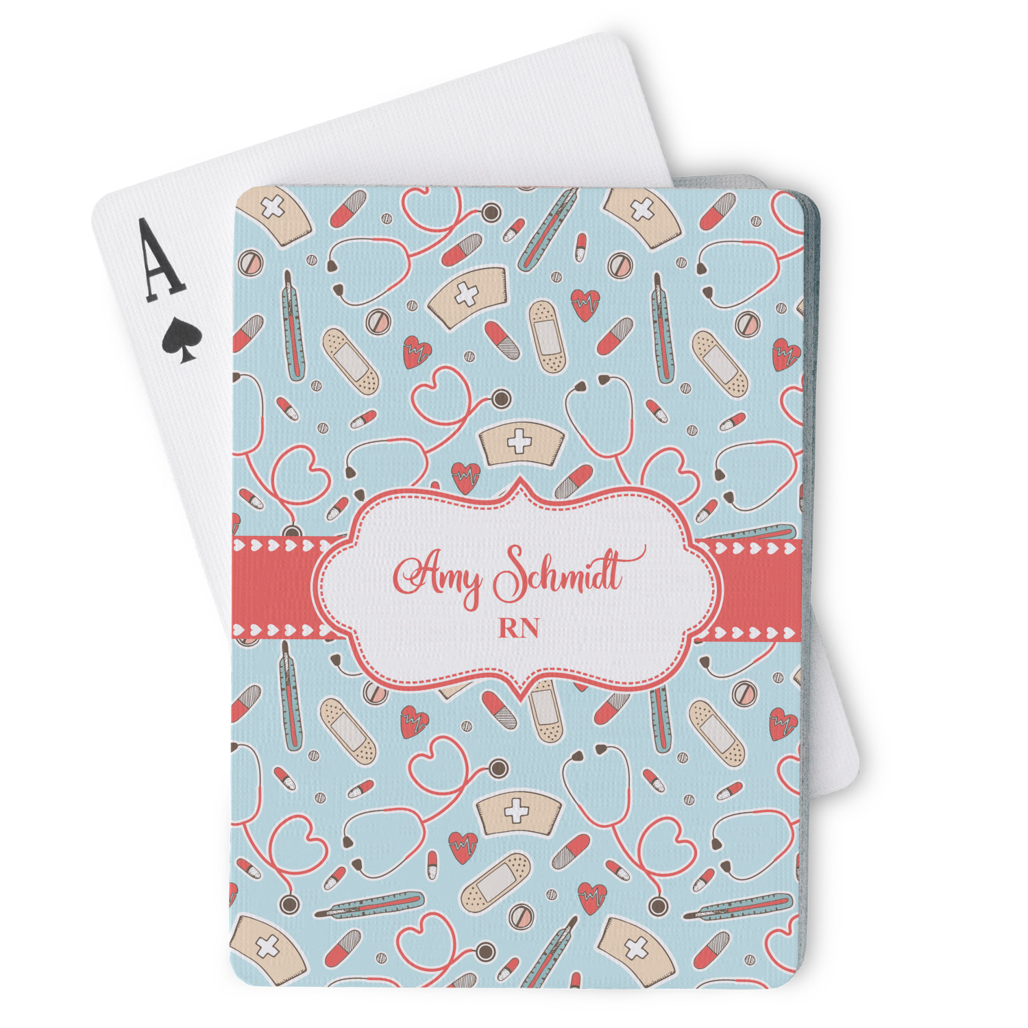 The customization / personalization is printed on the back side. The playing cards have a low gloss coating on both sides. The cards are packaged in a clear plastic box.