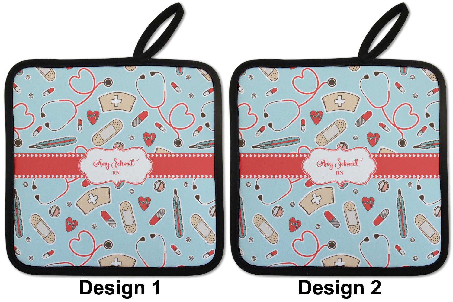 Our personalized pot holders feature a neoprene front that displays your personalization in vibrant colors. The backing of the hot pot holder is rubberized; the textured backing allows you to have a great grip when using this custom pot holder. The two materials are joined with a sleek, black trim, and the holder also includes an attached loop for hanging and storage. The pot holder is approximately 8.75 inches by 8.75 inches and 0.25 inches tall, while the fabric loop is 2.5 inches long. You can purchase a kitchen pot holder by itself or as a set of 2. We also offer a set including one pot holder and one oven mitt.
