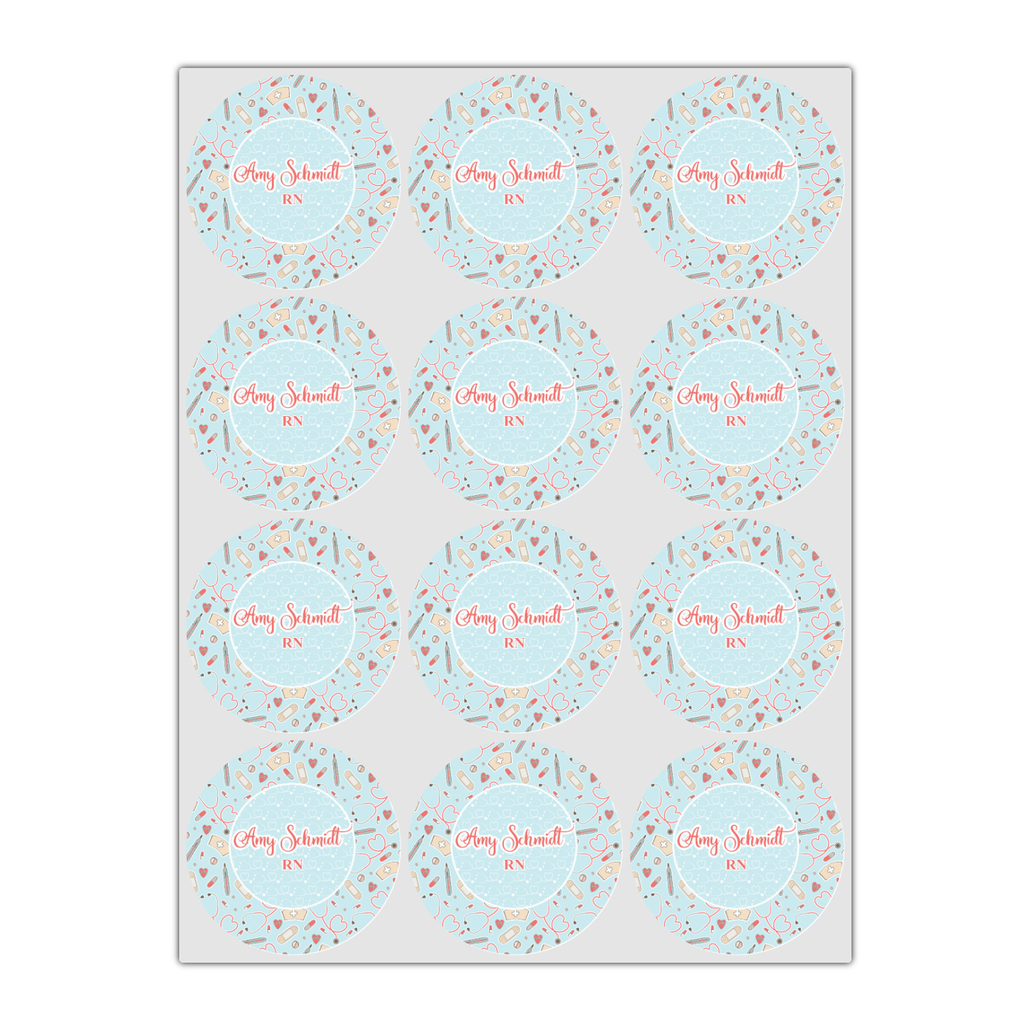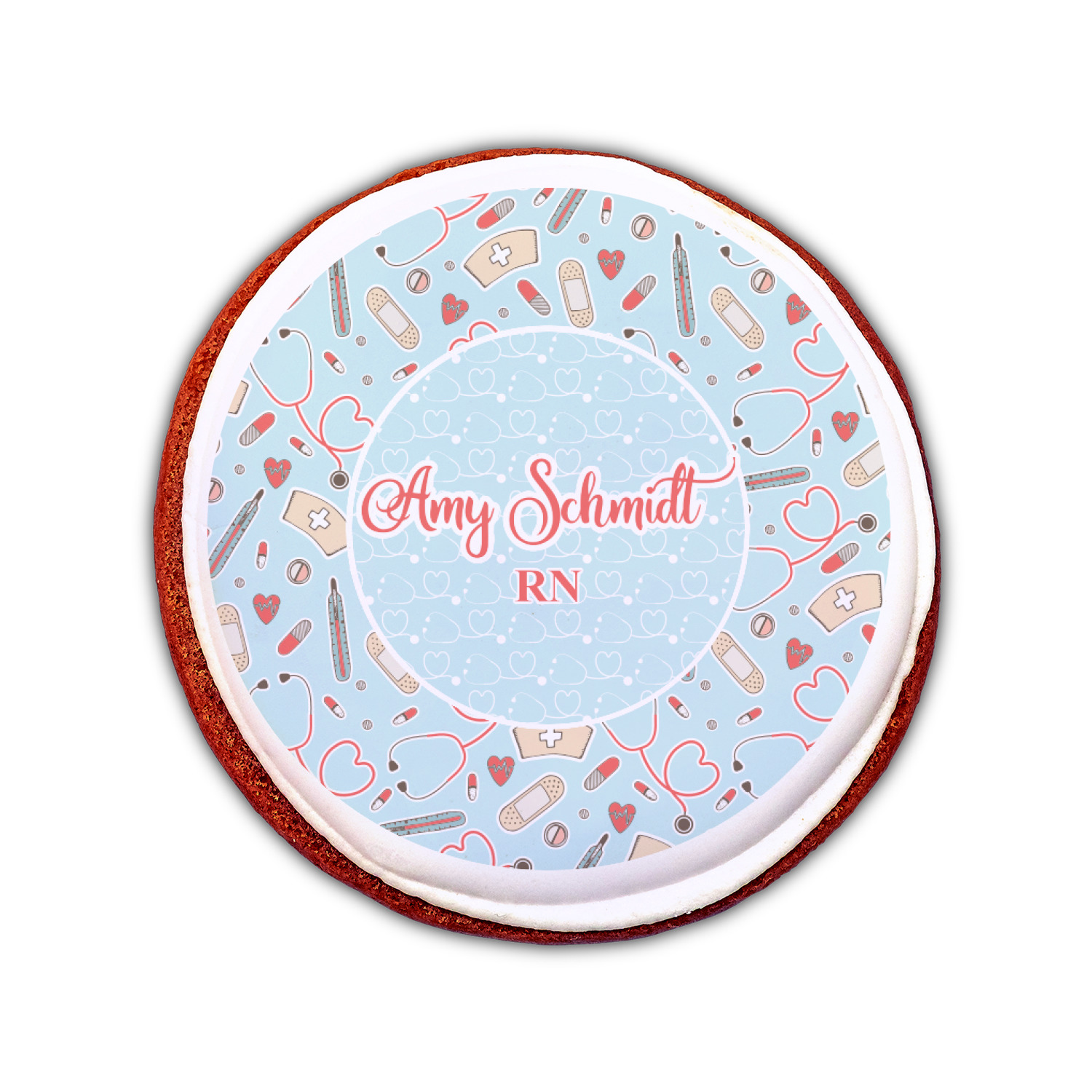This design features a fun pattern with illustrations of different nursing tools, such as a stethescope, band aid, medicine, and more! The background is a light blue, while the ribbon is a coral color. There is a frame in the middle to put your personalization.