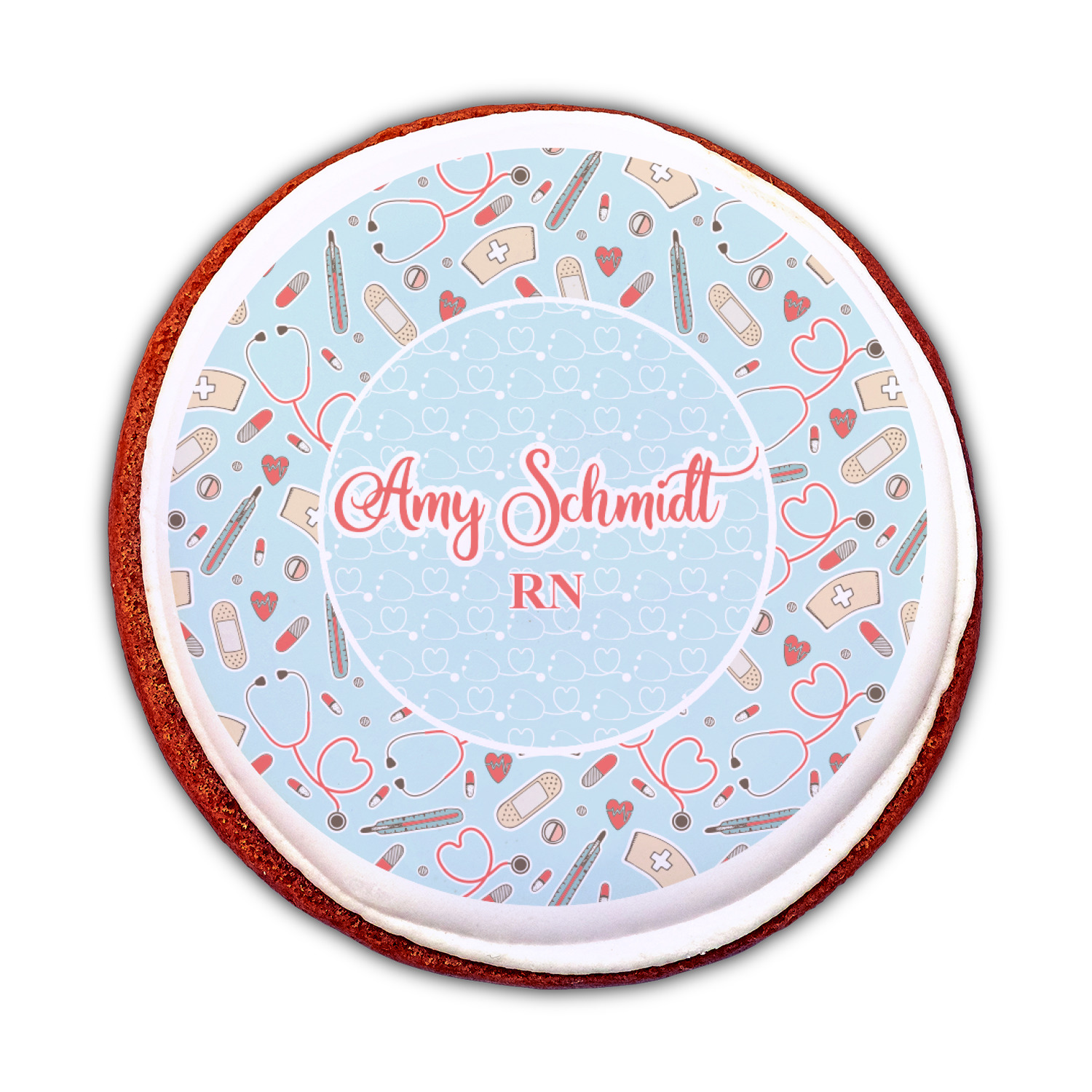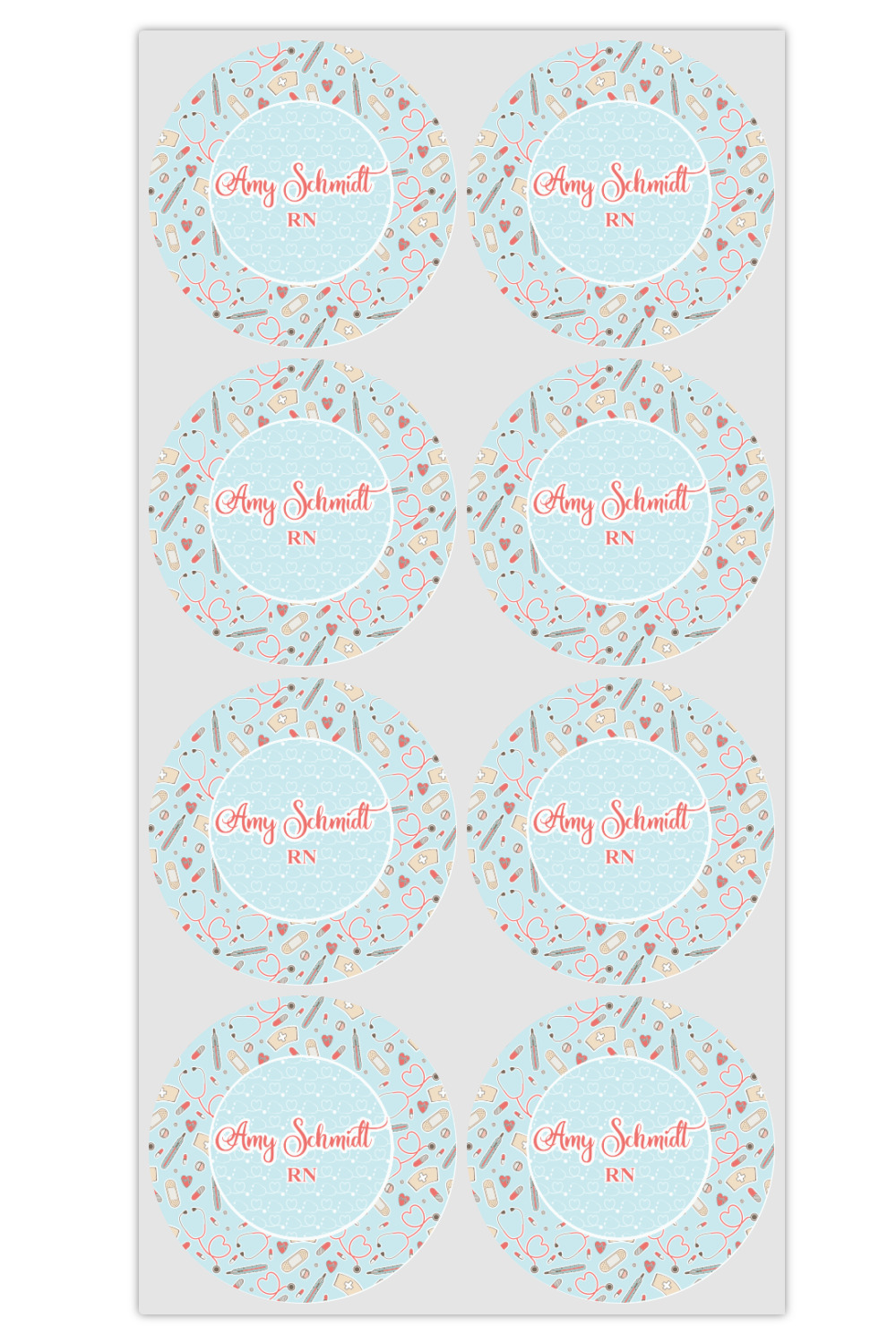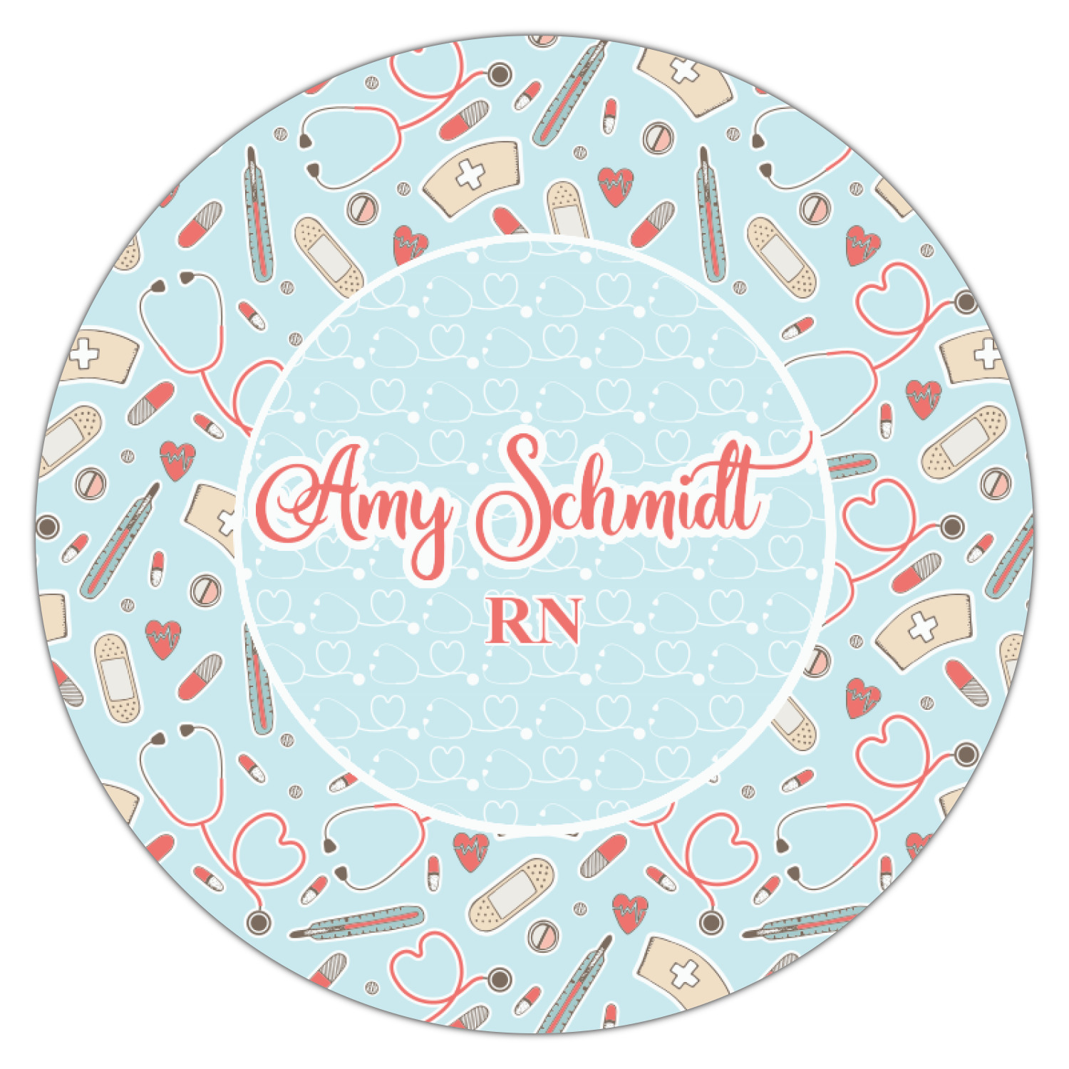 This design features a fun pattern with illustrations of different nursing tools, such as a stethescope, band aid, medicine, and more! The background is a light blue, while the ribbon is a coral color. There is a frame in the middle to put your personalization.