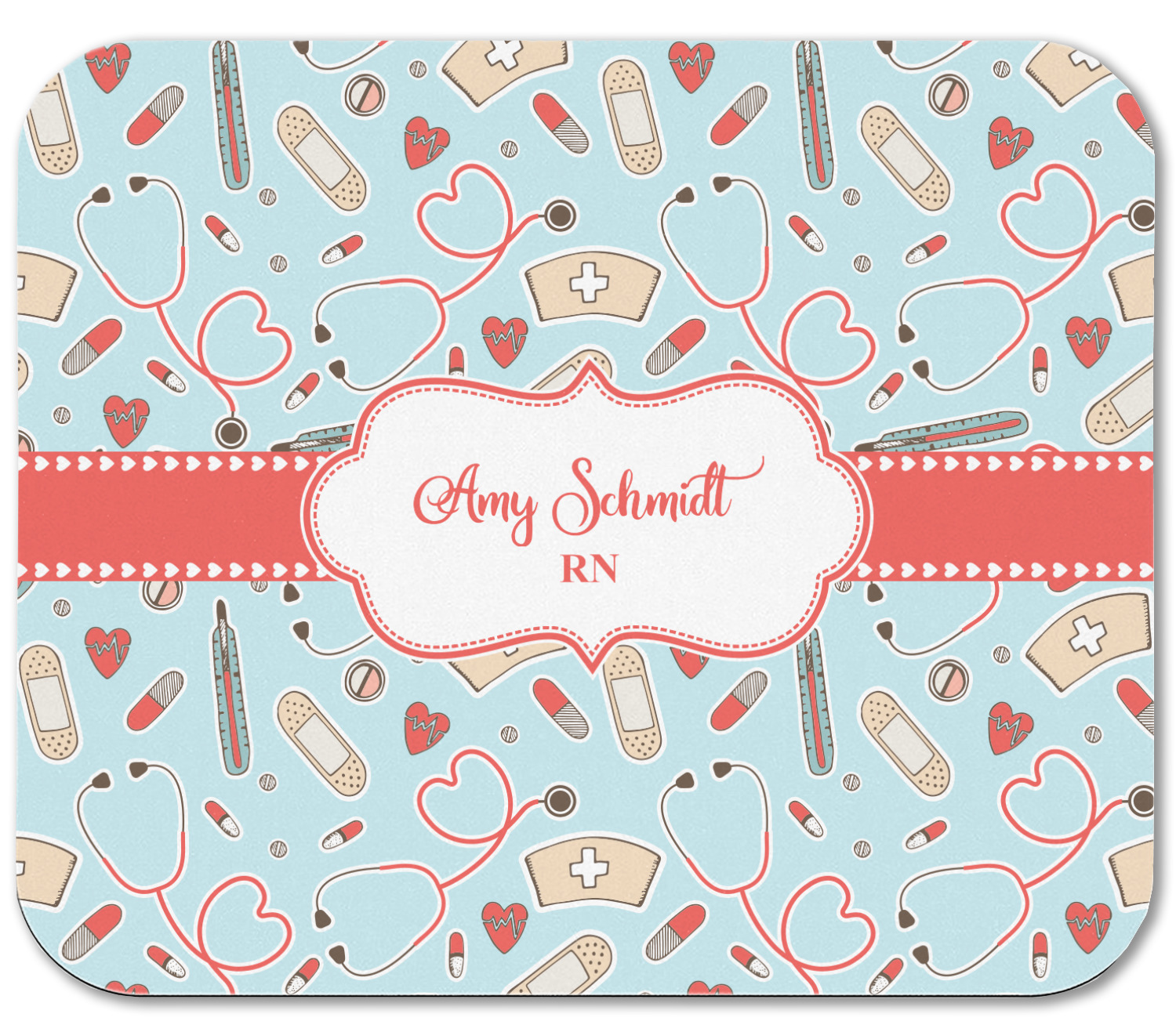 This design features a fun pattern with illustrations of different nursing tools, such as a stethescope, band aid, medicine, and more! The background is a light blue, while the ribbon is a coral color. There is a frame in the middle to put your personalization.