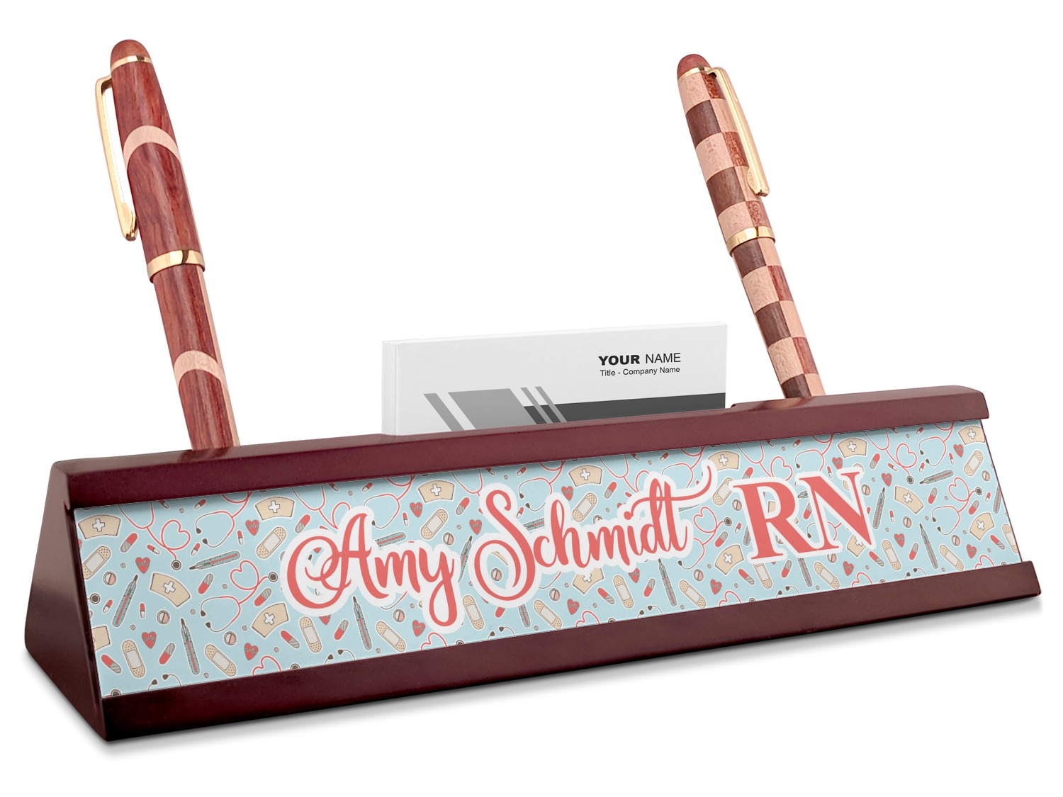 Your desk name plates are crafted from a high-quality, dark-cherry mahogany. At approximately 9.5 by 1.875 by 2.5 inches, this name plaque will fit perfectly, front and center, on your desk. Your customization spans across the entire face of the nameplate. Behind the nameplate lies a skinny slot that can fit approximately 15, traditionally-sized, business cards. You can also store your writing utensils on either side of this custom desk name plate.