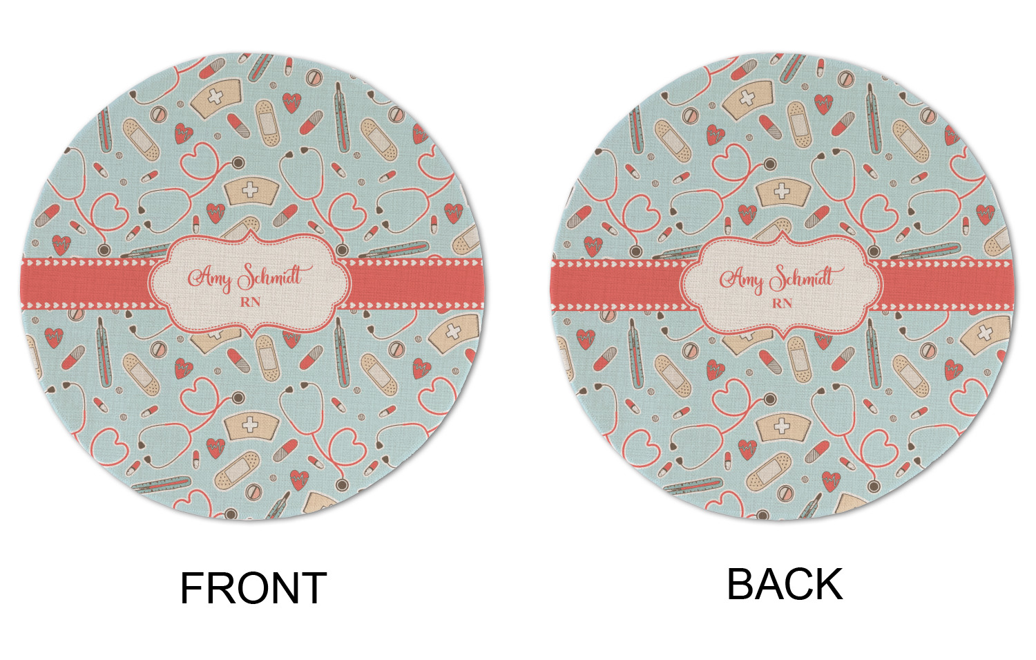 This design features a fun pattern with illustrations of different nursing tools, such as a stethescope, band aid, medicine, and more! The background is a light blue, while the ribbon is a coral color. There is a frame in the middle to put your personalization.