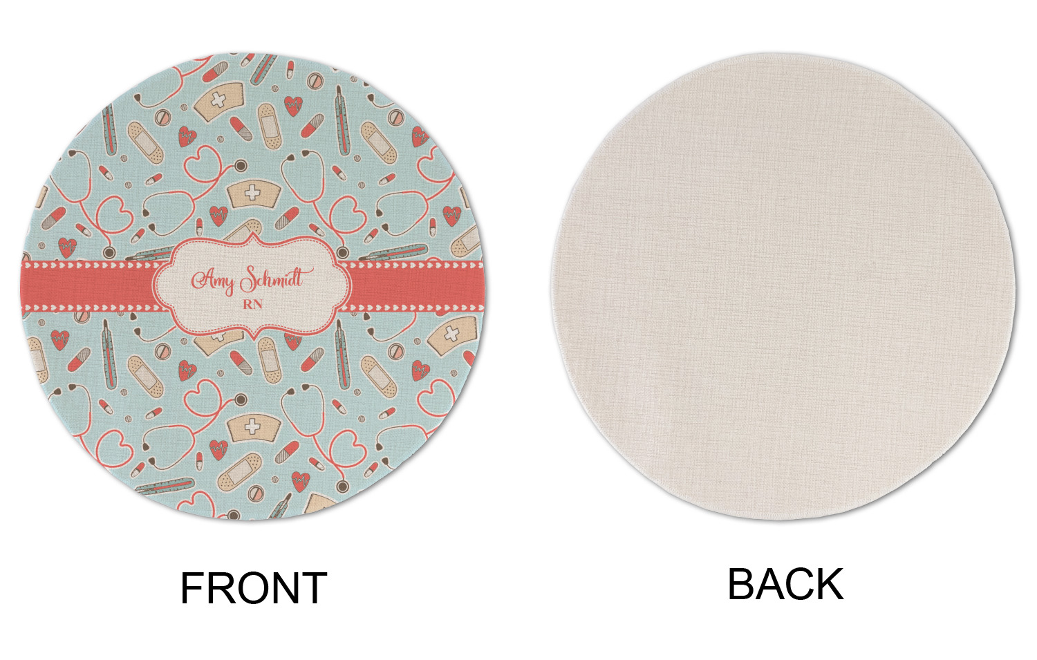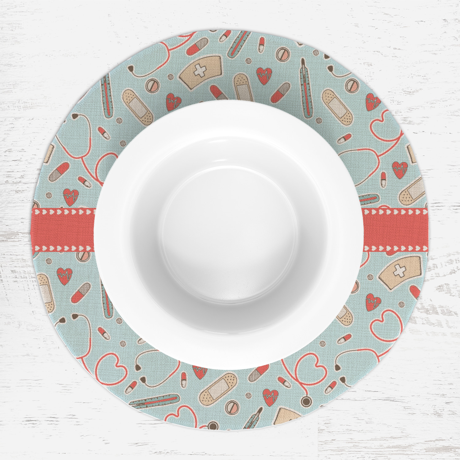 This design features a fun pattern with illustrations of different nursing tools, such as a stethescope, band aid, medicine, and more! The background is a light blue, while the ribbon is a coral color. There is a frame in the middle to put your personalization.
