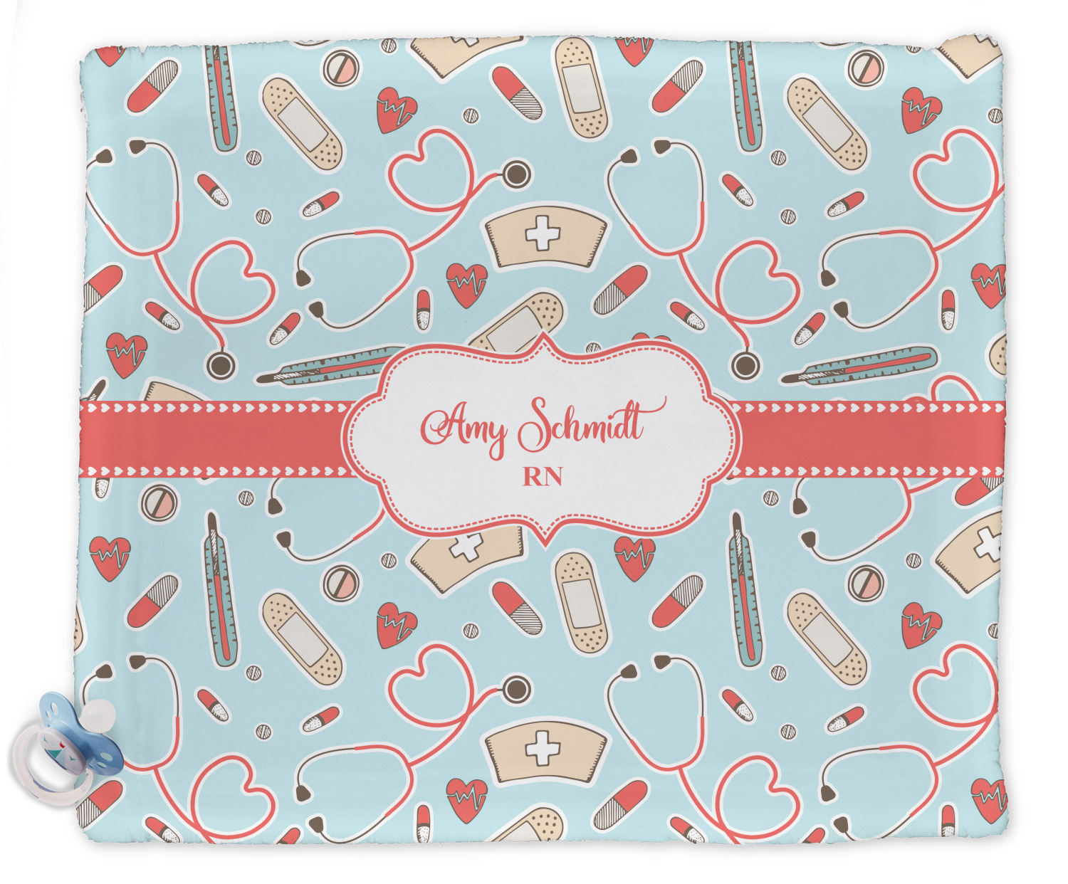 This design features a fun pattern with illustrations of different nursing tools, such as a stethescope, band aid, medicine, and more! The background is a light blue, while the ribbon is a coral color. There is a frame in the middle to put your personalization.