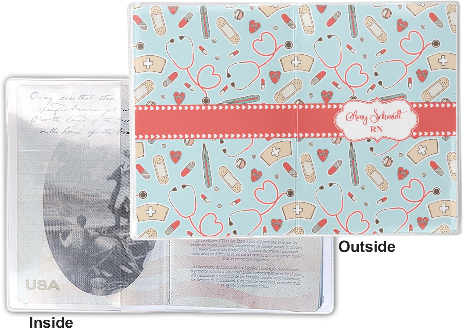 This cover is made of a sturdy clear vinyl with a personalized vinyl insert inside. There is a large and a small pocket on either side to hold the covers of your passport easily and firmly. The passport holder is approximately 7.5" x 5.25", the perfect size to snugly fit your passport. This slim cover is the perfect way to protect your passport without being one more bulky item you have to carry.