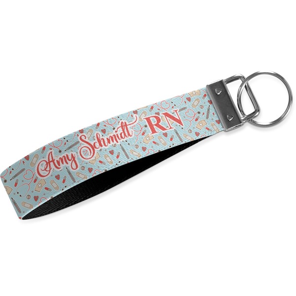These key fob keychains are made from a polyester weave, right here in the USA. They feature a silver, metal clasp, attached to a round keyring. The piece gives the personalized wristlet a beautiful, finished look. Your customized design is printed on the outside of the keychain strap. We carry these wristlets in two sizes: small, which is 5 inches in width, and large, which is 5.5 inches in width.