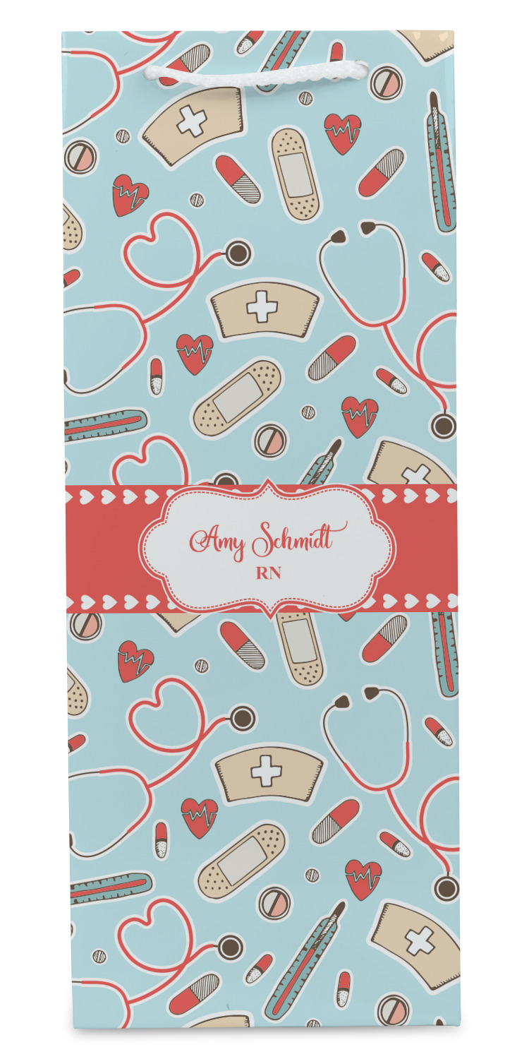 This design features a fun pattern with illustrations of different nursing tools, such as a stethescope, band aid, medicine, and more! The background is a light blue, while the ribbon is a coral color. There is a frame in the middle to put your personalization.
