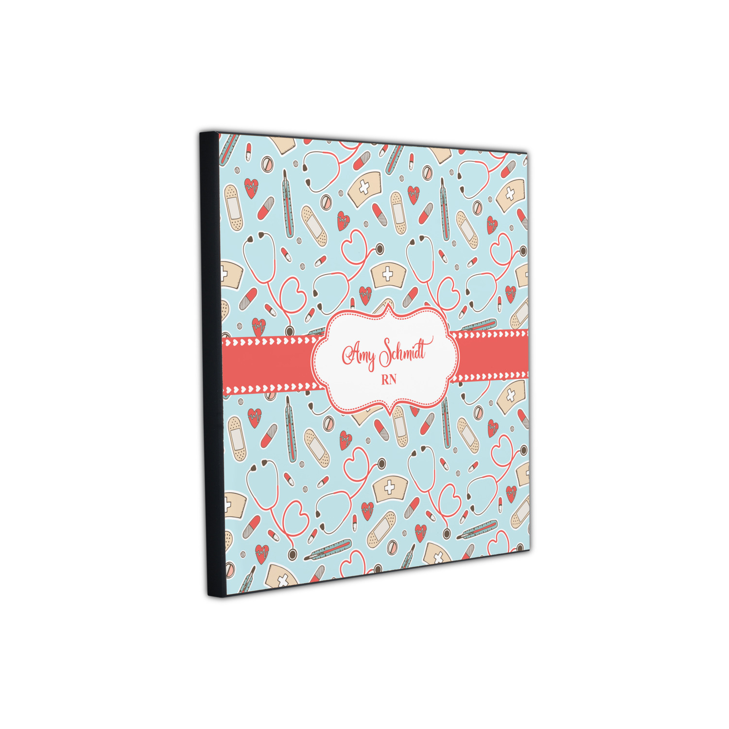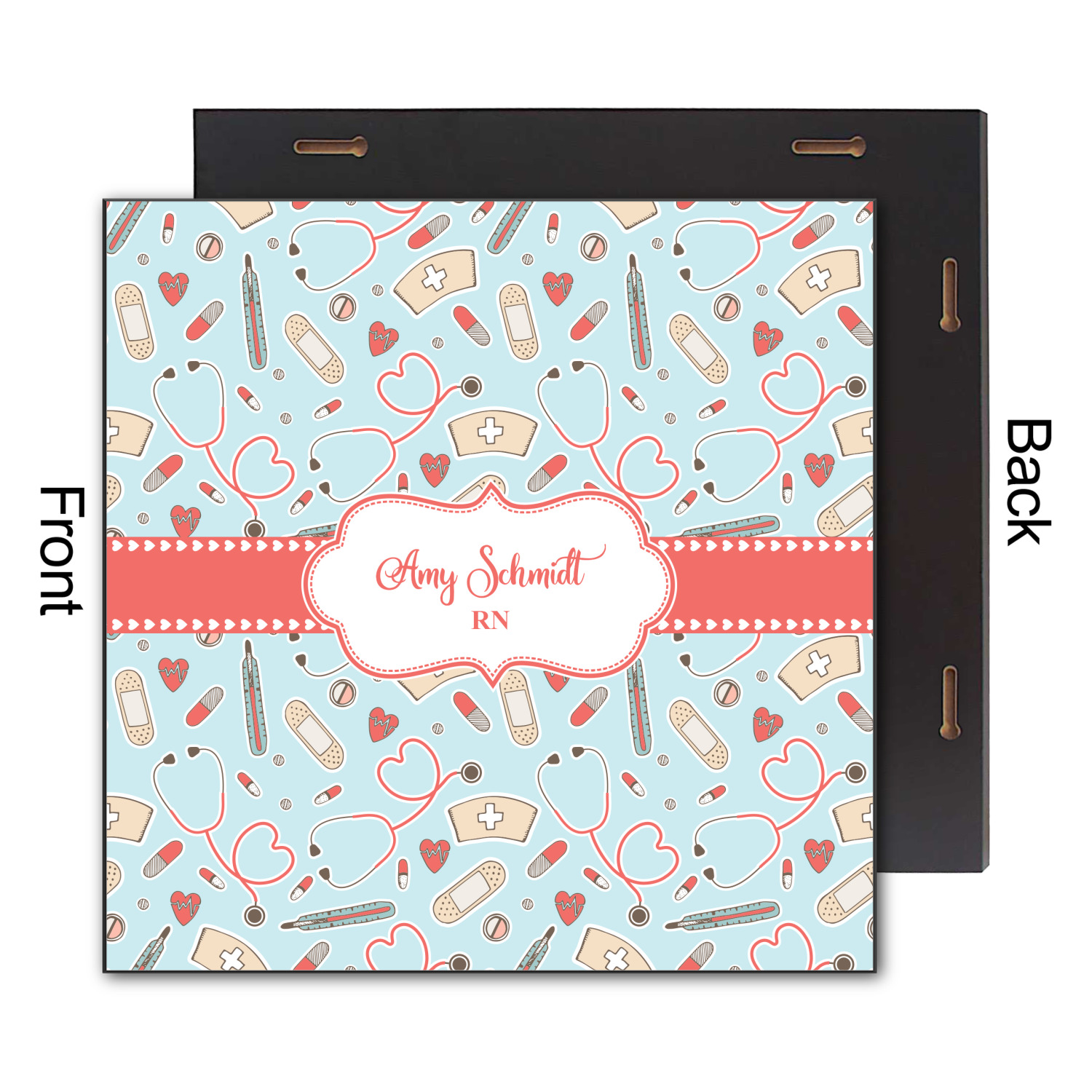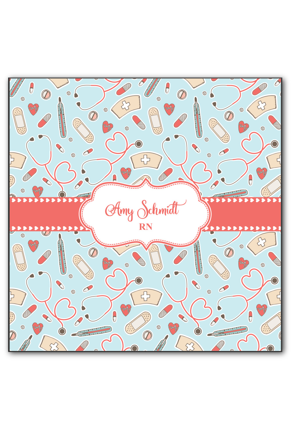 This design features a fun pattern with illustrations of different nursing tools, such as a stethescope, band aid, medicine, and more! The background is a light blue, while the ribbon is a coral color. There is a frame in the middle to put your personalization.