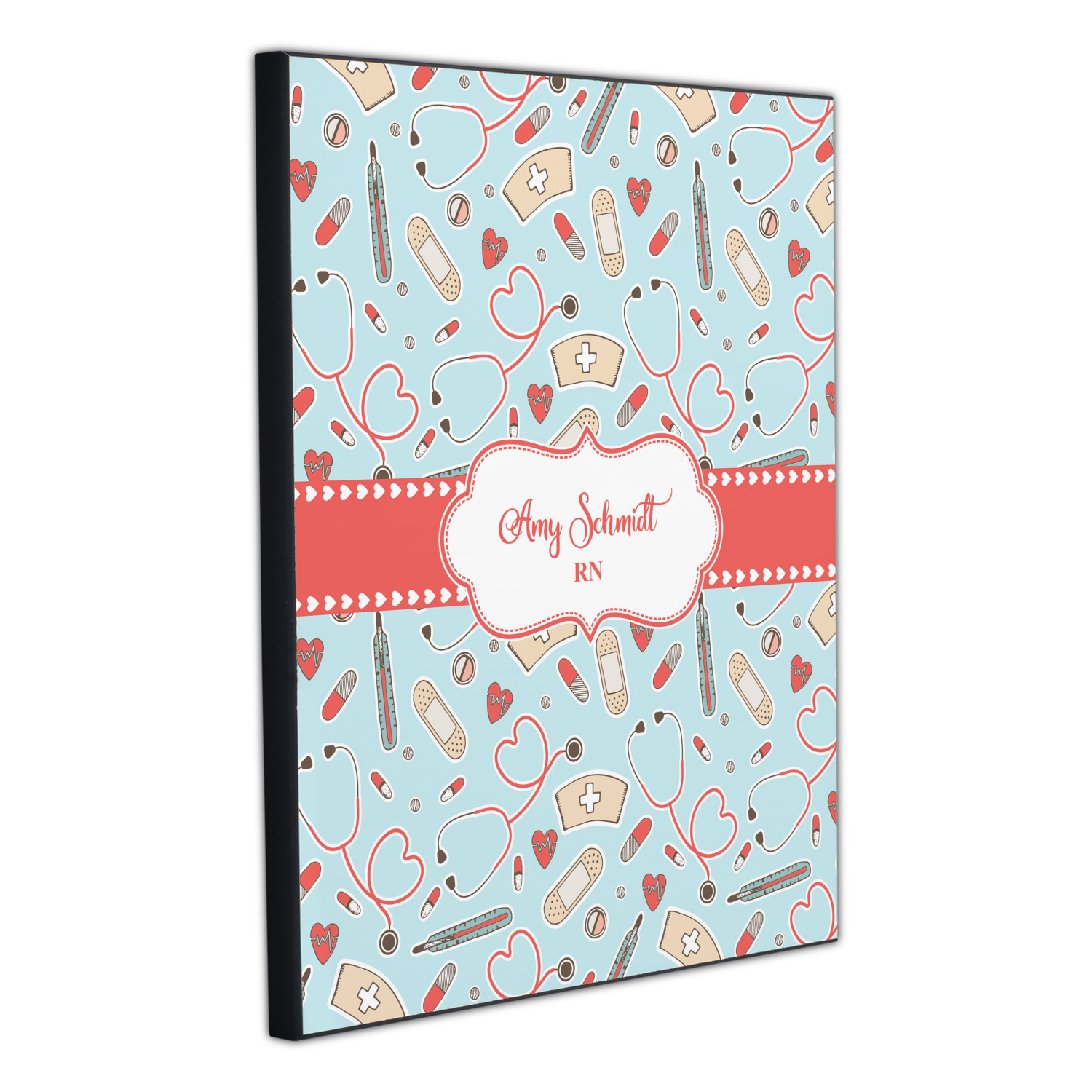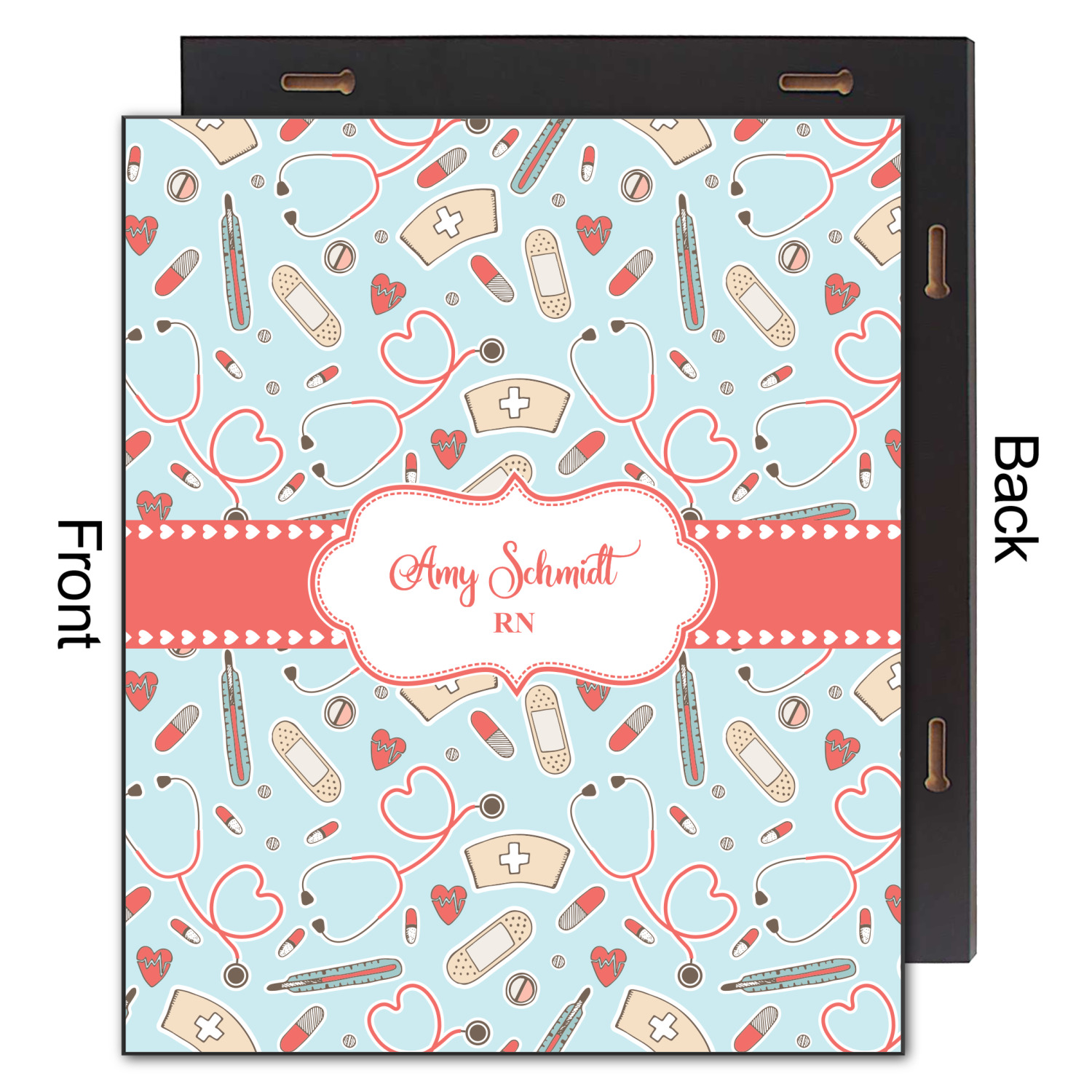 This design features a fun pattern with illustrations of different nursing tools, such as a stethescope, band aid, medicine, and more! The background is a light blue, while the ribbon is a coral color. There is a frame in the middle to put your personalization.