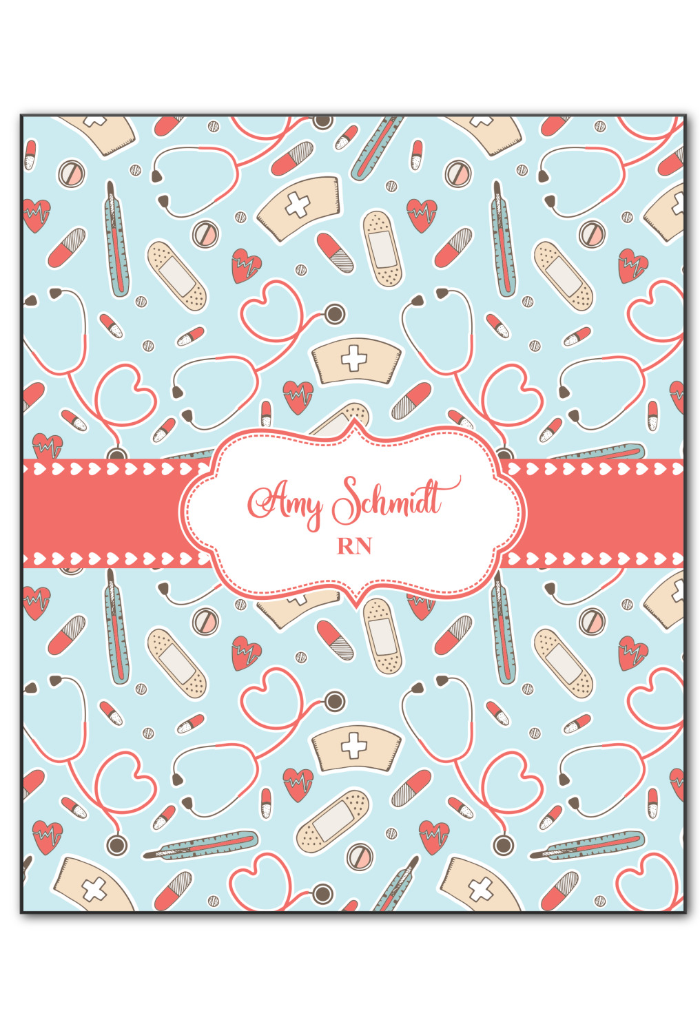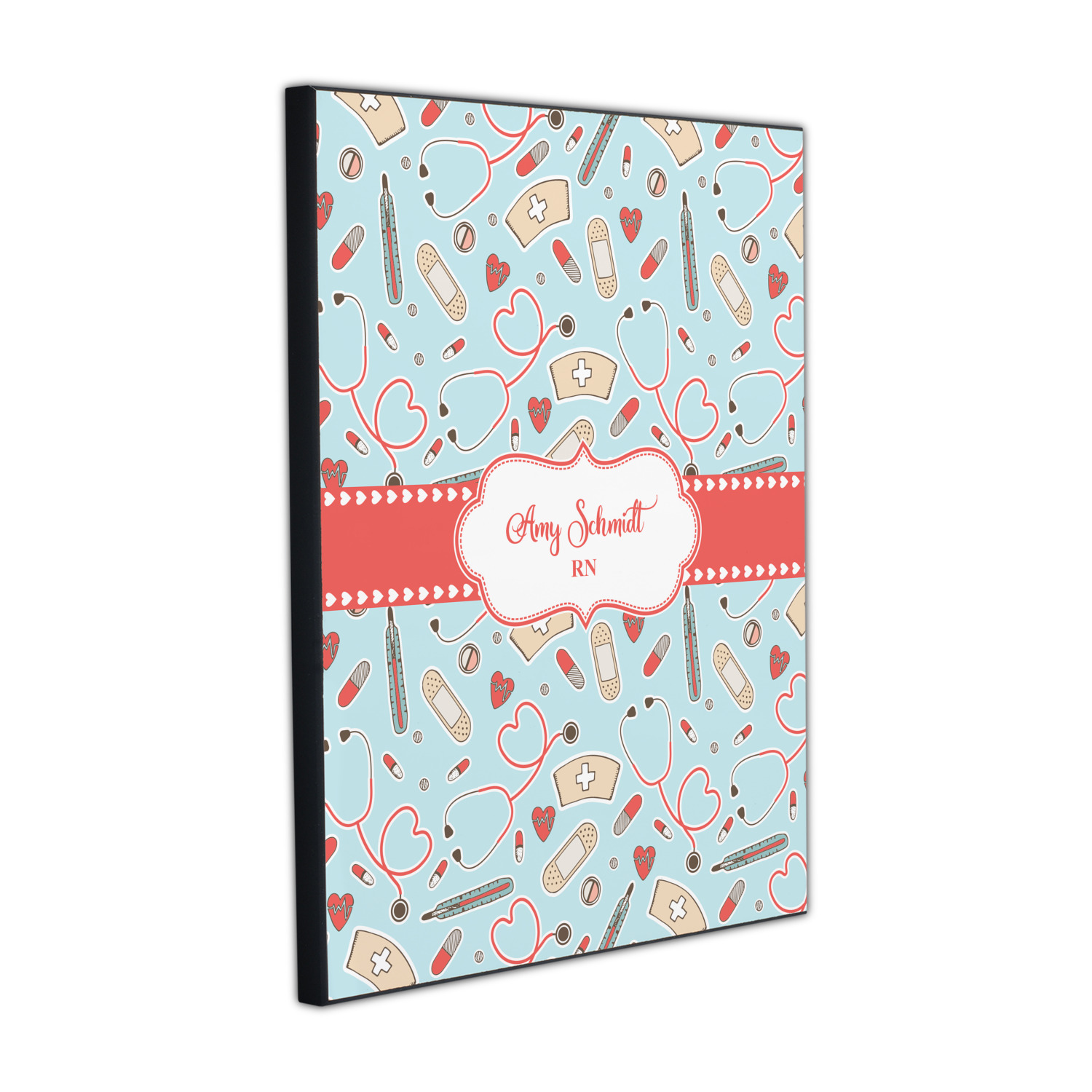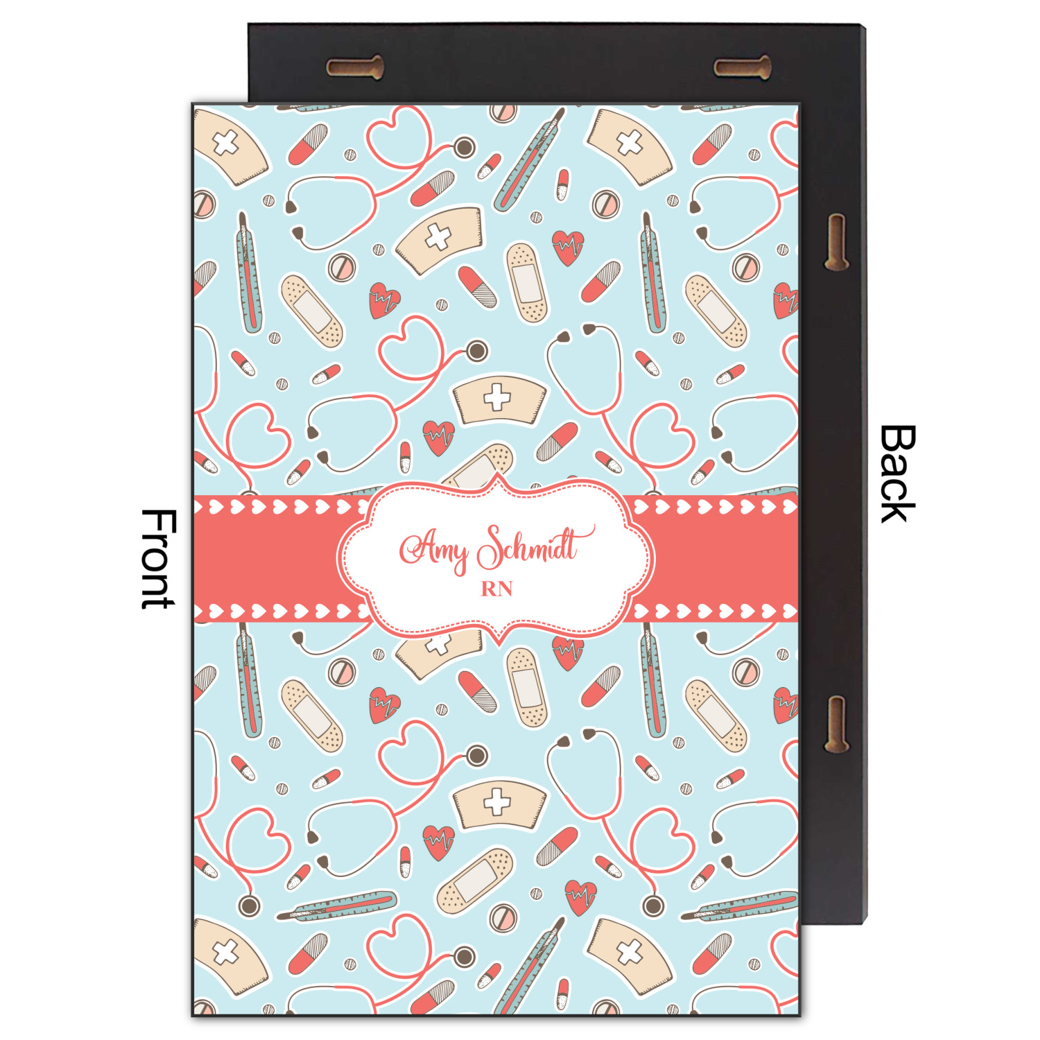 This design features a fun pattern with illustrations of different nursing tools, such as a stethescope, band aid, medicine, and more! The background is a light blue, while the ribbon is a coral color. There is a frame in the middle to put your personalization.