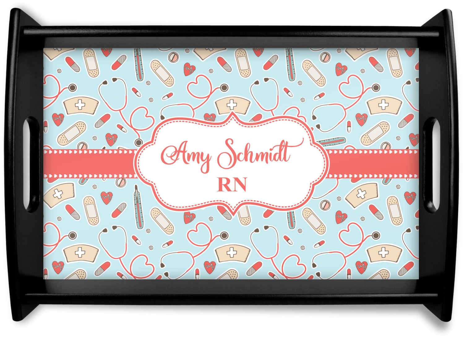 This design features a fun pattern with illustrations of different nursing tools, such as a stethescope, band aid, medicine, and more! The background is a light blue, while the ribbon is a coral color. There is a frame in the middle to put your personalization.
