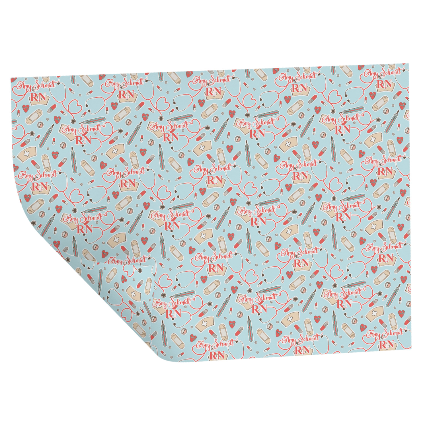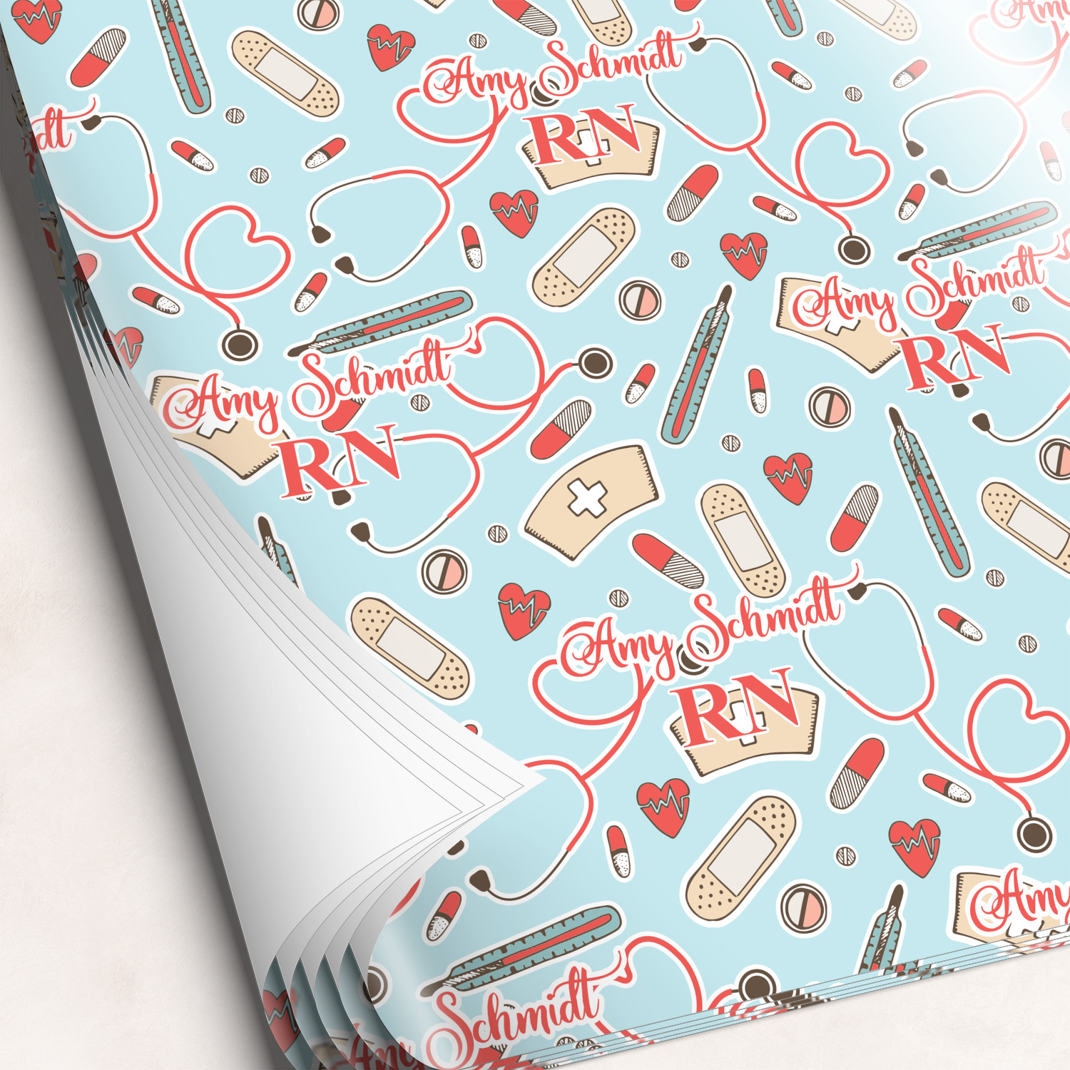 This design features a fun pattern with illustrations of different nursing tools, such as a stethescope, band aid, medicine, and more! The background is a light blue, while the ribbon is a coral color. There is a frame in the middle to put your personalization.