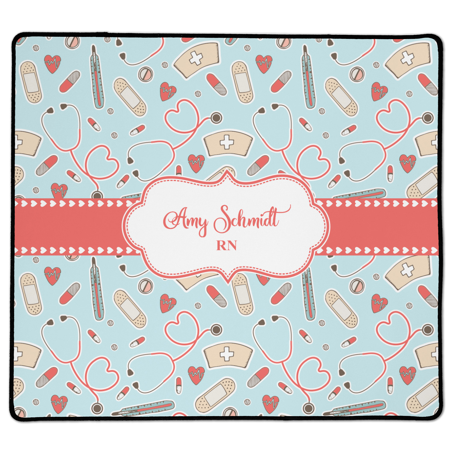 This design features a fun pattern with illustrations of different nursing tools, such as a stethescope, band aid, medicine, and more! The background is a light blue, while the ribbon is a coral color. There is a frame in the middle to put your personalization.
