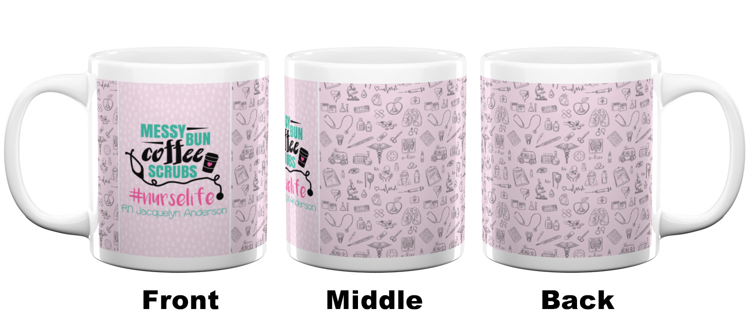 This design features a quote saying "messy bun, coffee, scrubs, #nurselife." The background has two different subtle patterns. One has subtle dots, while the other has fun illustrations of different medical tools and symbols. The two backgrounds are a soft pink. The quote has several different colors including pink, black, and teal.