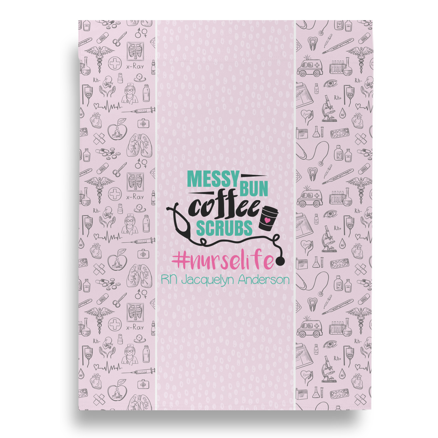This design features a quote saying "messy bun, coffee, scrubs, #nurselife." The background has two different subtle patterns. One has subtle dots, while the other has fun illustrations of different medical tools and symbols. The two backgrounds are a soft pink. The quote has several different colors including pink, black, and teal.