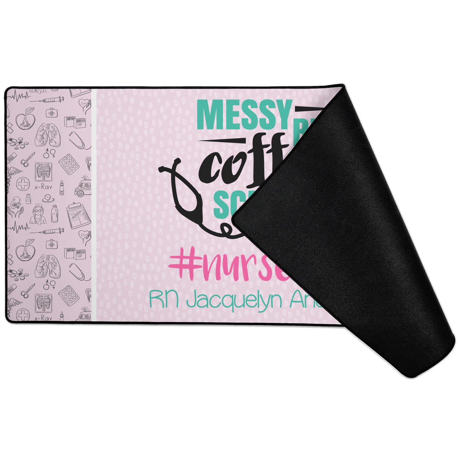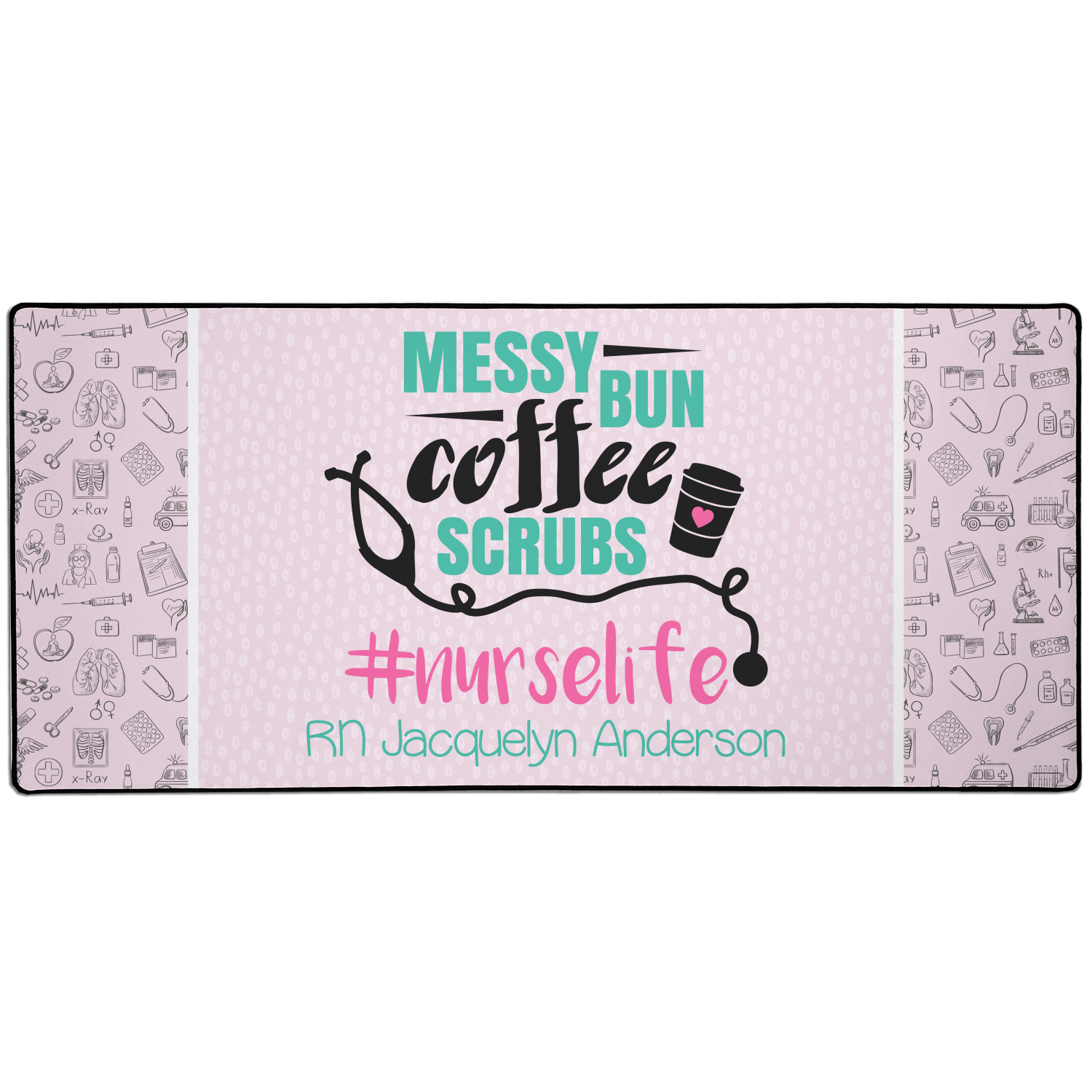 This design features a quote saying "messy bun, coffee, scrubs, #nurselife." The background has two different subtle patterns. One has subtle dots, while the other has fun illustrations of different medical tools and symbols. The two backgrounds are a soft pink. The quote has several different colors including pink, black, and teal.