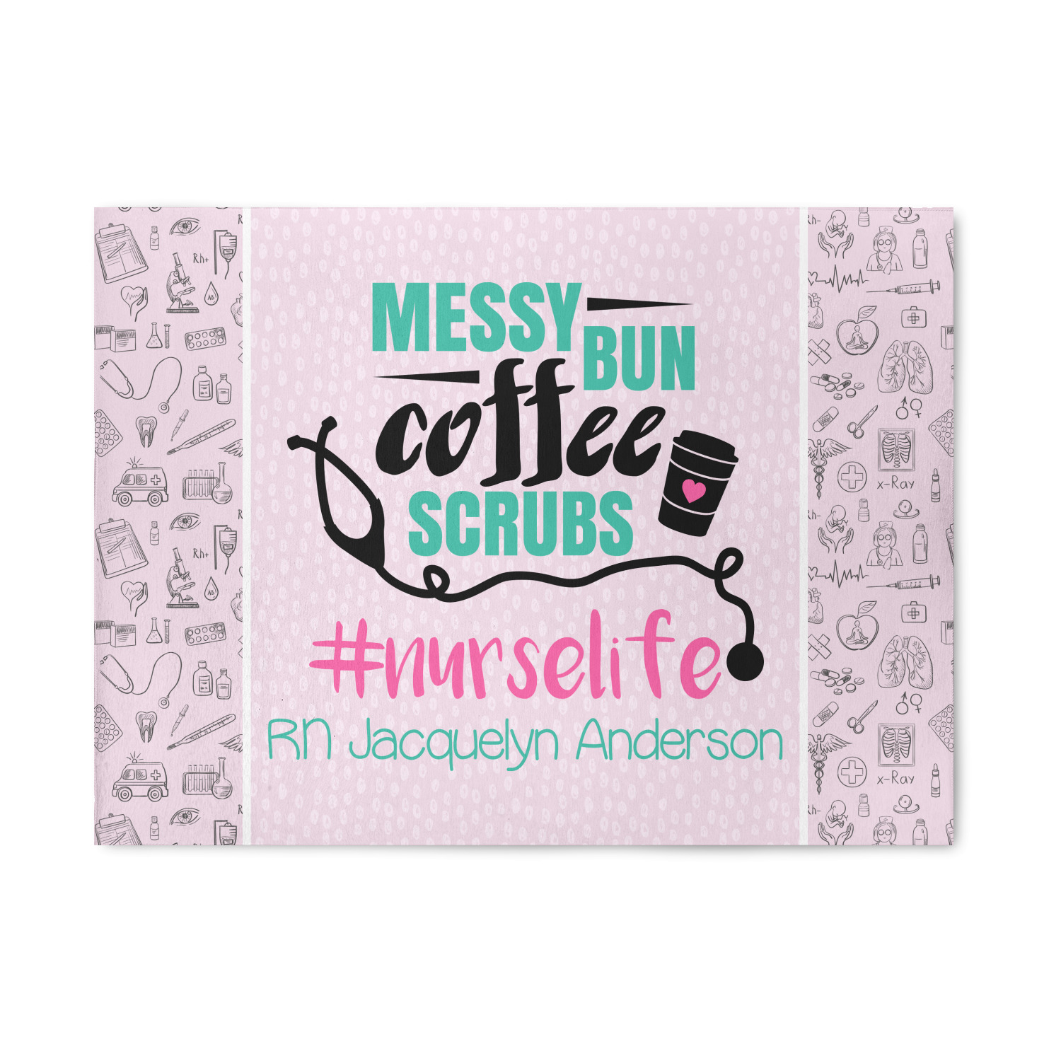 This design features a quote saying "messy bun, coffee, scrubs, #nurselife." The background has two different subtle patterns. One has subtle dots, while the other has fun illustrations of different medical tools and symbols. The two backgrounds are a soft pink. The quote has several different colors including pink, black, and teal.