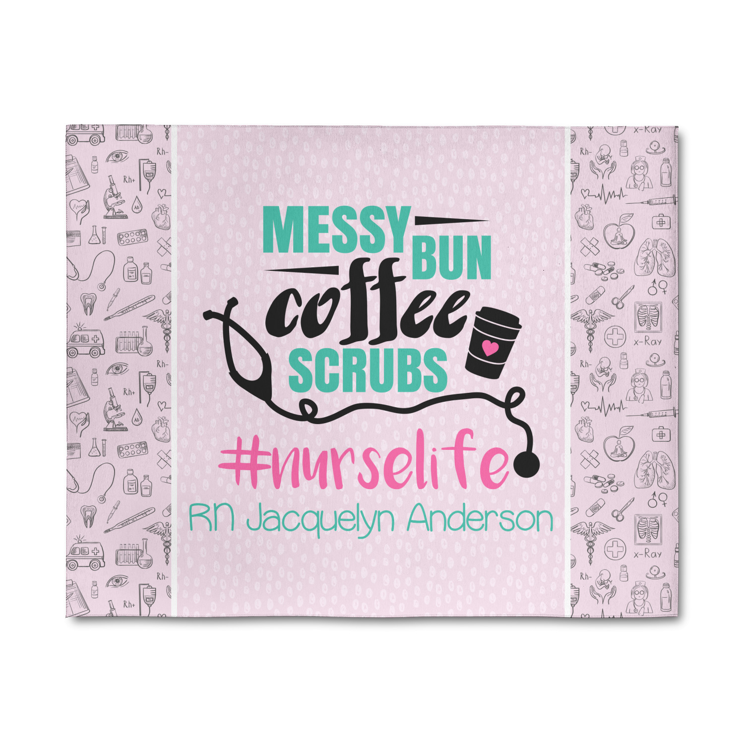 This design features a quote saying "messy bun, coffee, scrubs, #nurselife." The background has two different subtle patterns. One has subtle dots, while the other has fun illustrations of different medical tools and symbols. The two backgrounds are a soft pink. The quote has several different colors including pink, black, and teal.