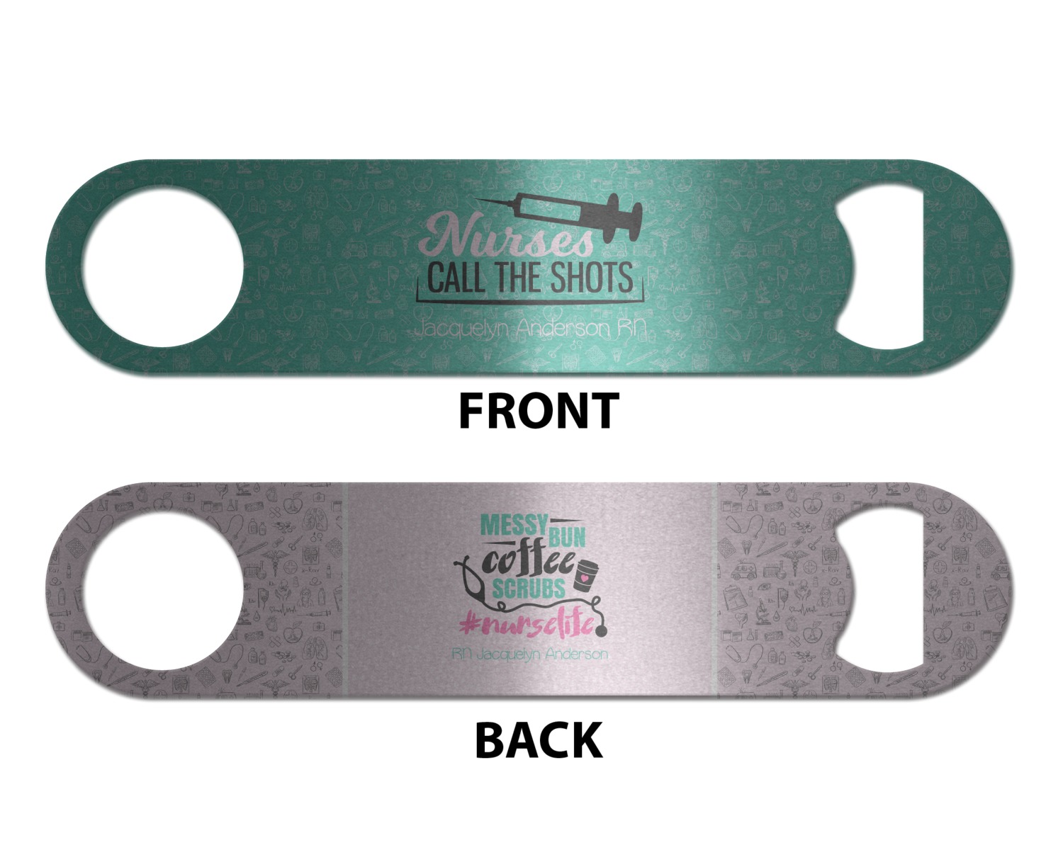 Made from stainless steel, these beer bottle openers are 7 by 1.625 inches, giving you plenty of leverage when trying to open a stubborn bottle. On one end of this personalized bottle opener, you'll find a circular hole for you to hang and display your opener. On the opposite end, you'll find the tool used for opening bottles. This opener in particular has the same structure and style as professional bartender bottle openers. Your customization is sublimated onto both the back and front, and both sides can be customized individually. Choose from one of our two base colors - white or silver.
