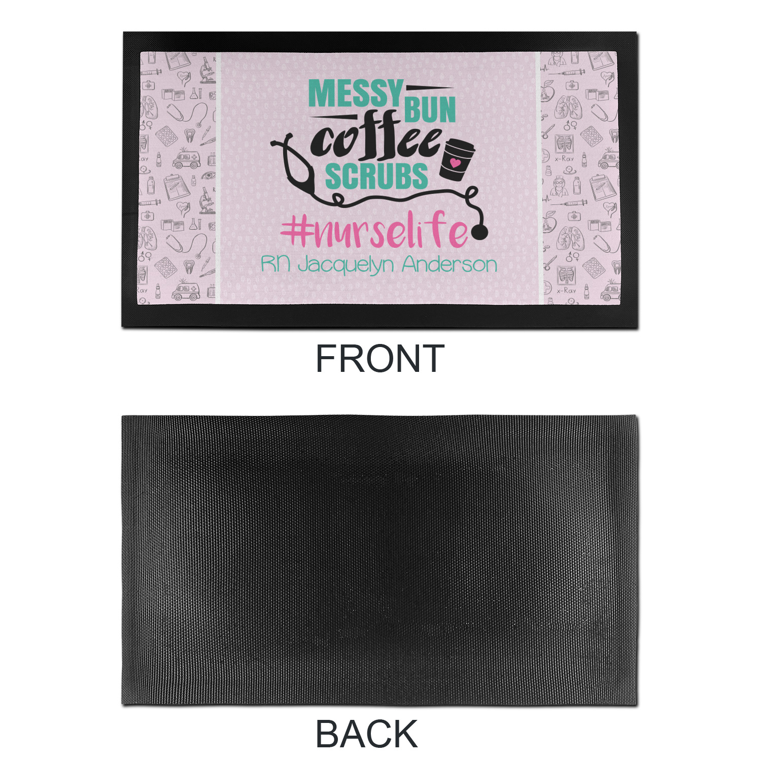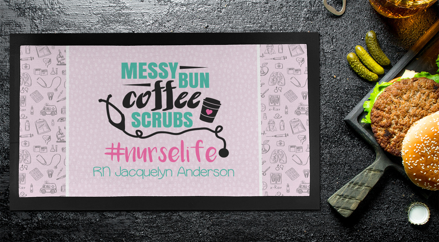This design features a quote saying "messy bun, coffee, scrubs, #nurselife." The background has two different subtle patterns. One has subtle dots, while the other has fun illustrations of different medical tools and symbols. The two backgrounds are a soft pink. The quote has several different colors including pink, black, and teal.