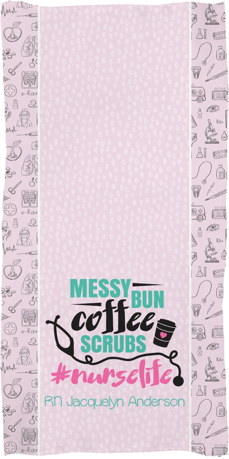 This design features a quote saying "messy bun, coffee, scrubs, #nurselife." The background has two different subtle patterns. One has subtle dots, while the other has fun illustrations of different medical tools and symbols. The two backgrounds are a soft pink. The quote has several different colors including pink, black, and teal.