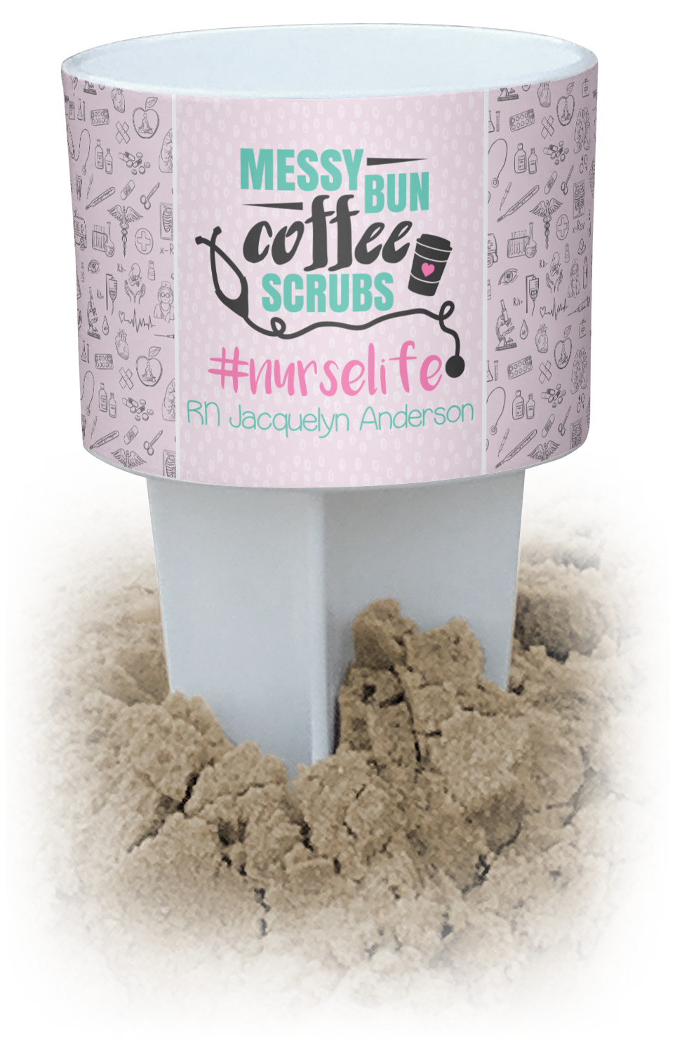 This cup holder has a large stake at its bottom that anchors it to the sand or ground below, while the cup holder rests above the stake. The entire drink holder is made of durable plastic and displays your customization around the cup holder portion. We sell these personalized beach spikers in two different colors: black and white.