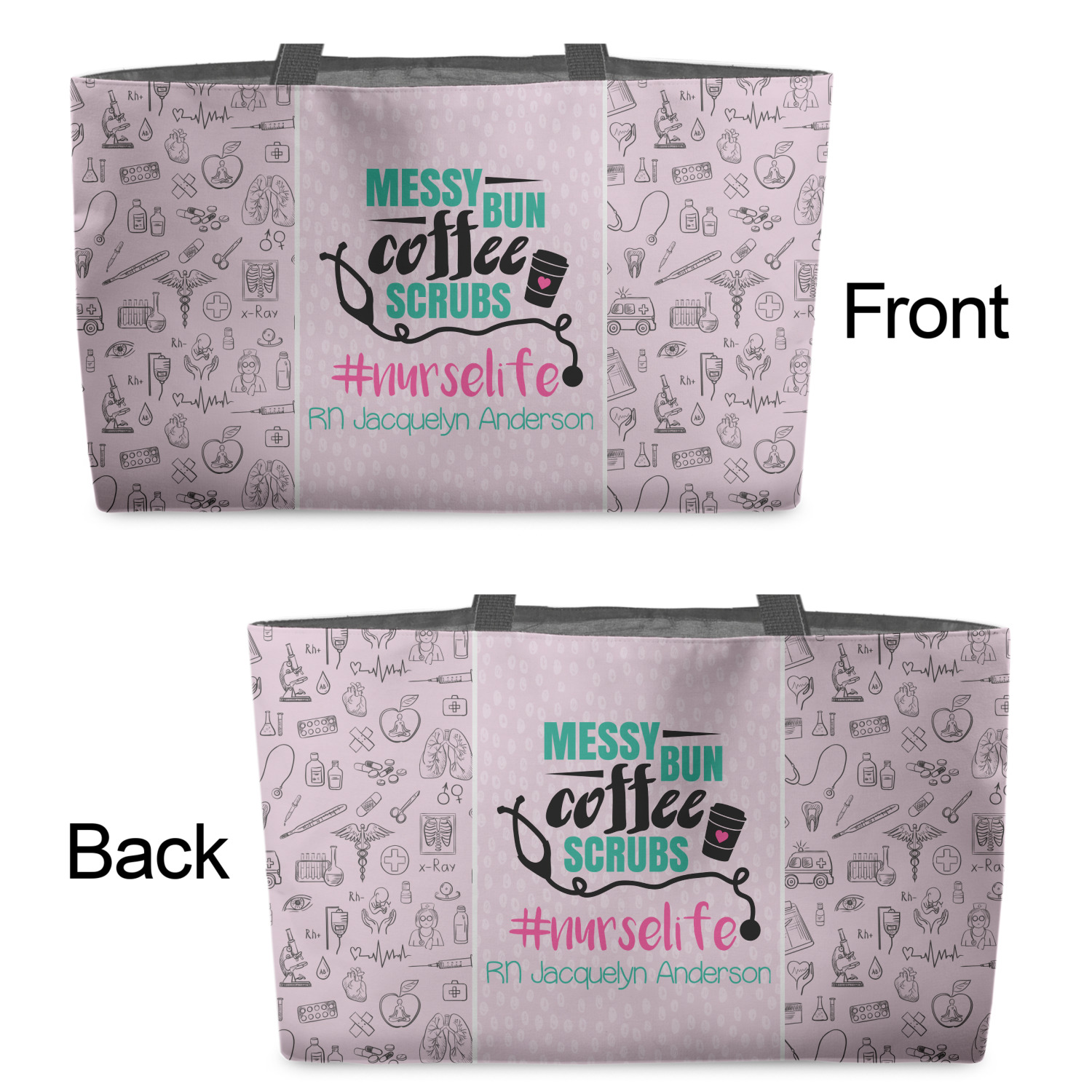 This design features a quote saying "messy bun, coffee, scrubs, #nurselife." The background has two different subtle patterns. One has subtle dots, while the other has fun illustrations of different medical tools and symbols. The two backgrounds are a soft pink. The quote has several different colors including pink, black, and teal.