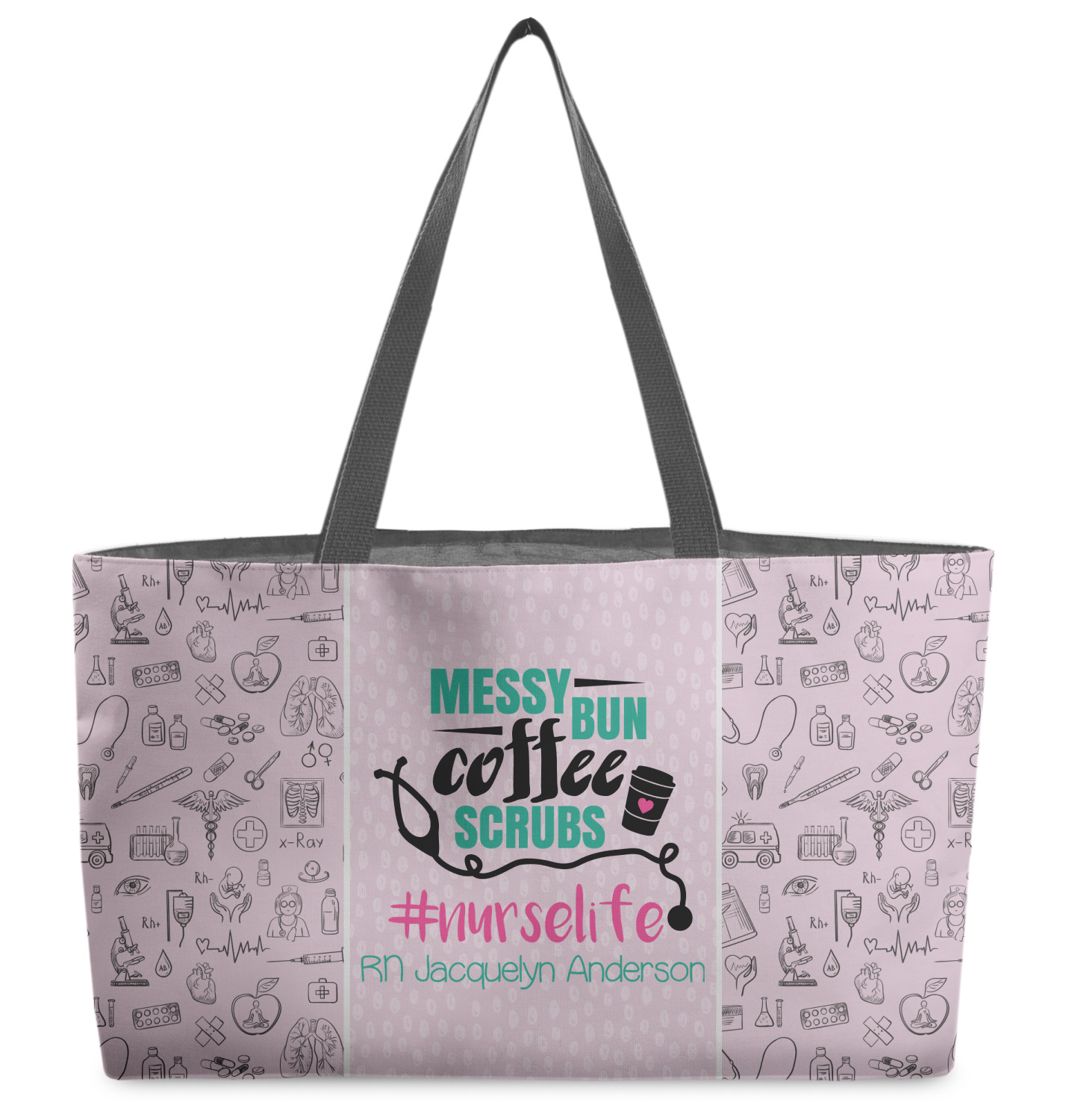 These beach totes are handmade here in the USA. Fabric is printed with your design. The tote is then sewn from the fabric pieces, lining and handles added.