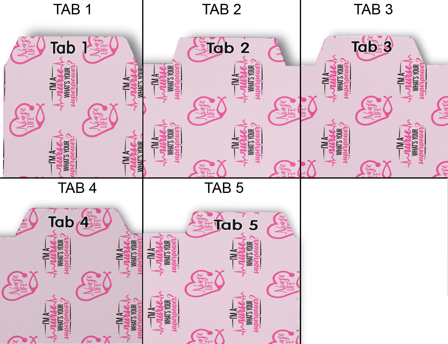 Whether you use binders at school or at work, we have designs to suit all of them. Available in 5 or 6 tab sets, you are sure to find a set to suit your needs. The back of each one is white and can be used to take notes, write vital information on, etc.