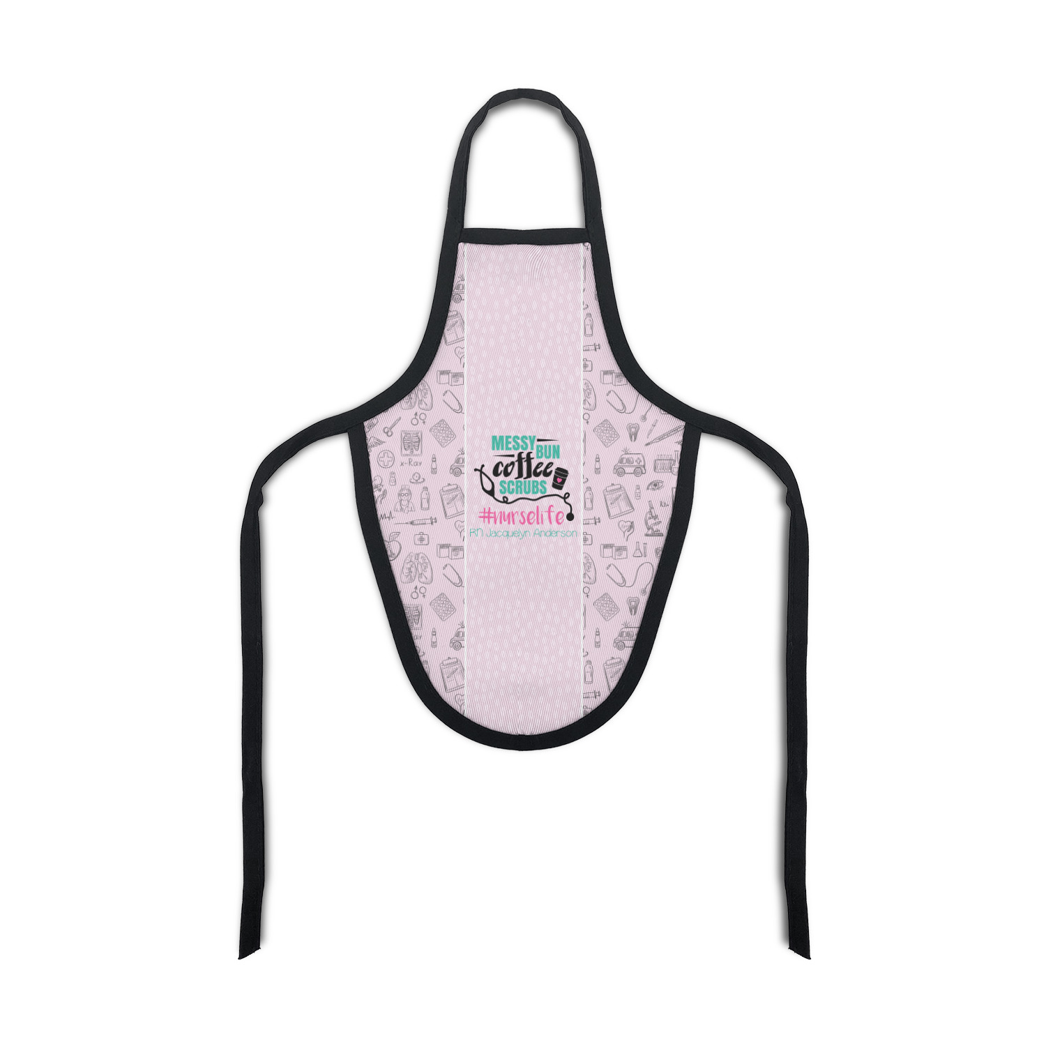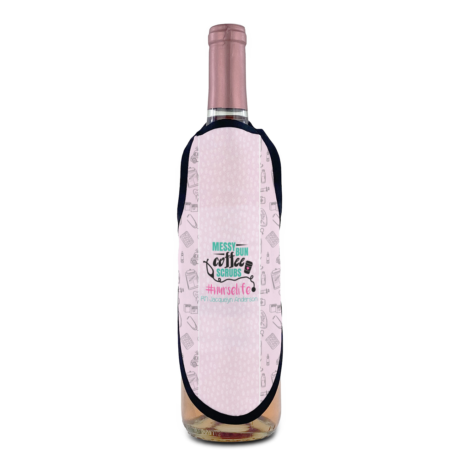 This design features a quote saying "messy bun, coffee, scrubs, #nurselife." The background has two different subtle patterns. One has subtle dots, while the other has fun illustrations of different medical tools and symbols. The two backgrounds are a soft pink. The quote has several different colors including pink, black, and teal.