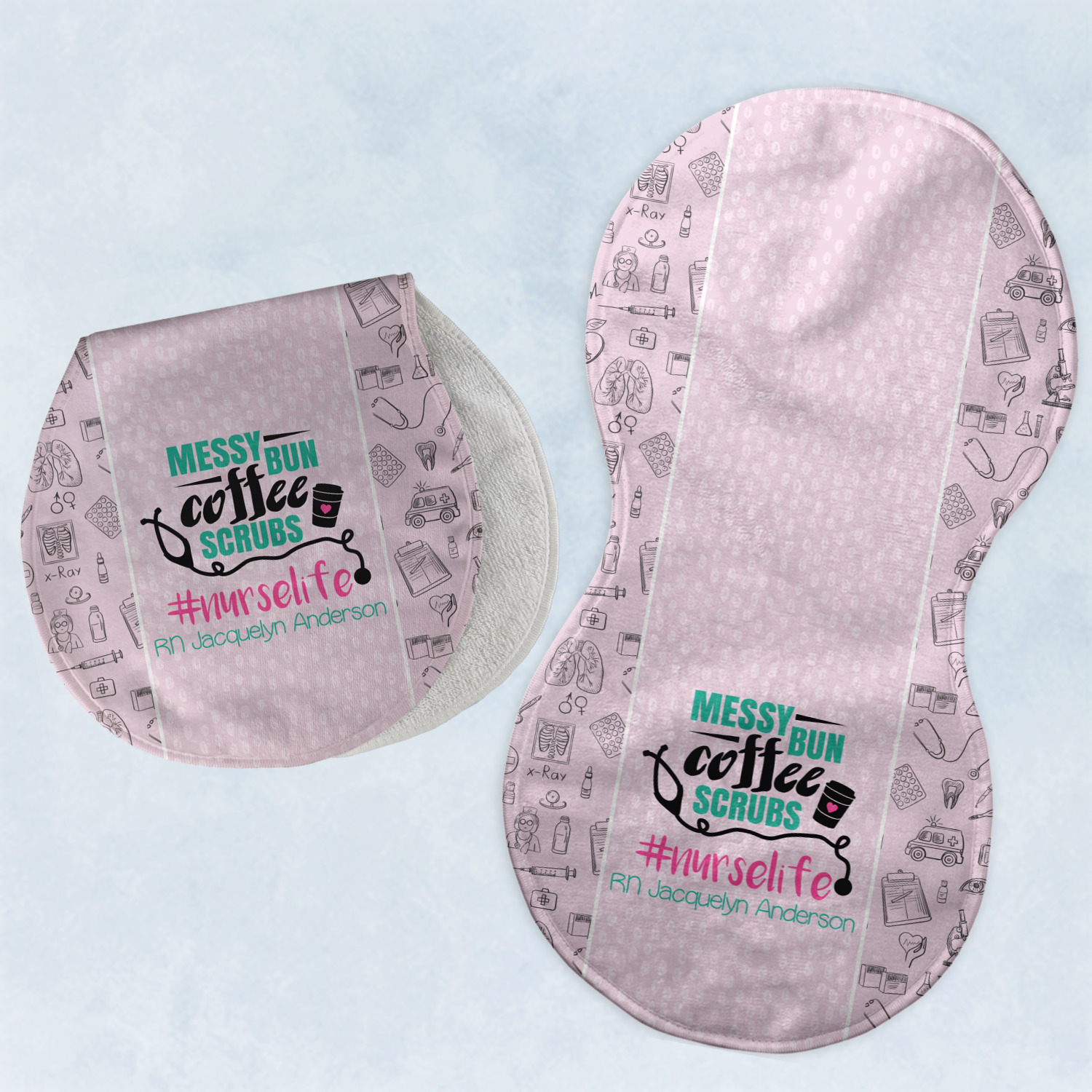 This design features a quote saying "messy bun, coffee, scrubs, #nurselife." The background has two different subtle patterns. One has subtle dots, while the other has fun illustrations of different medical tools and symbols. The two backgrounds are a soft pink. The quote has several different colors including pink, black, and teal.