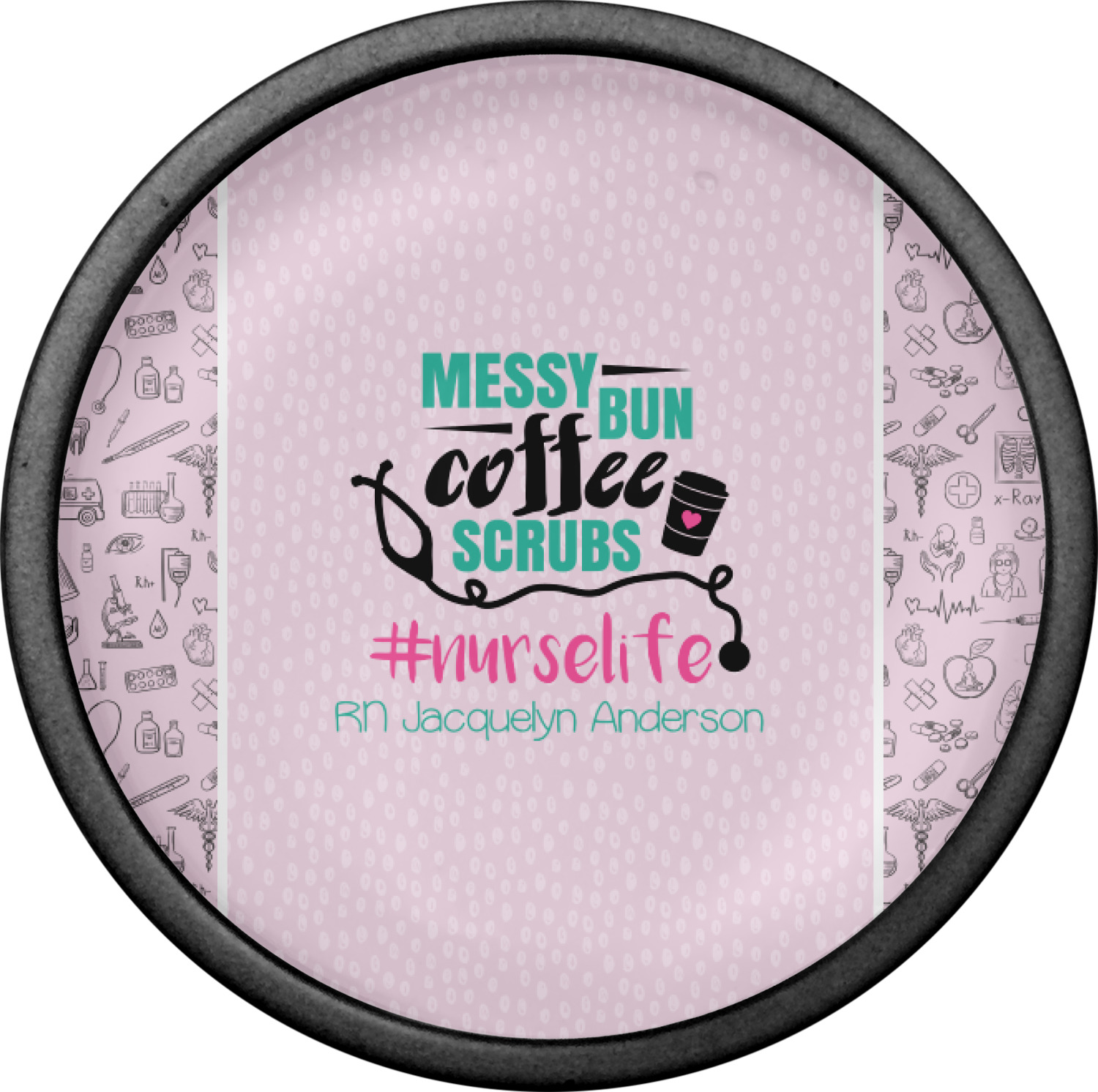 This design features a quote saying "messy bun, coffee, scrubs, #nurselife." The background has two different subtle patterns. One has subtle dots, while the other has fun illustrations of different medical tools and symbols. The two backgrounds are a soft pink. The quote has several different colors including pink, black, and teal.
