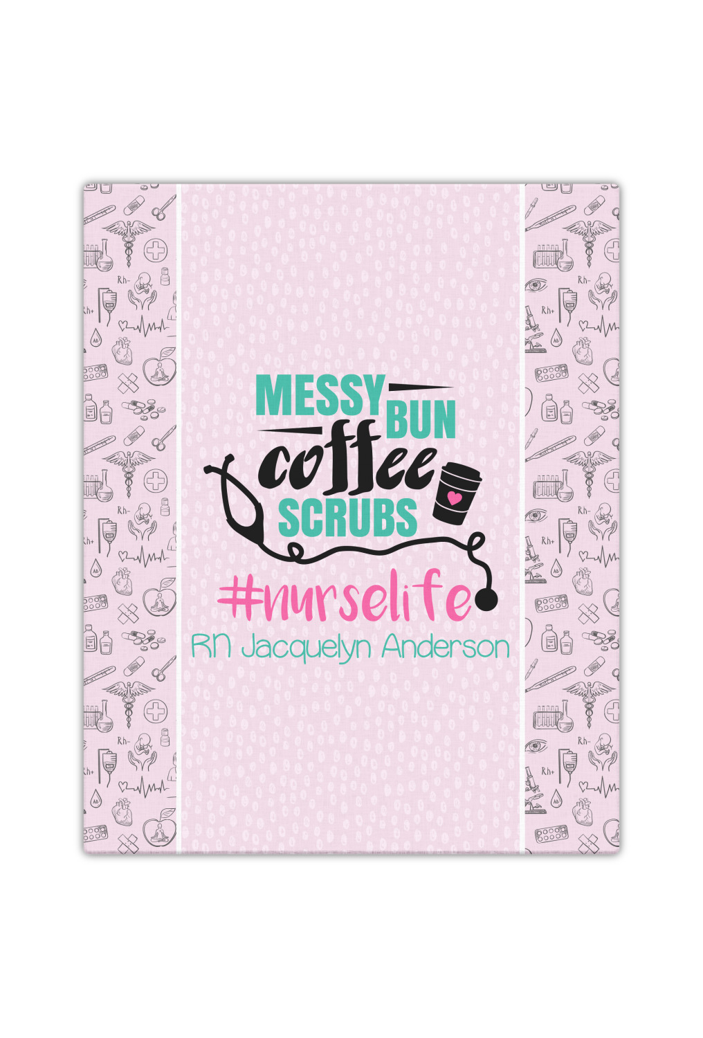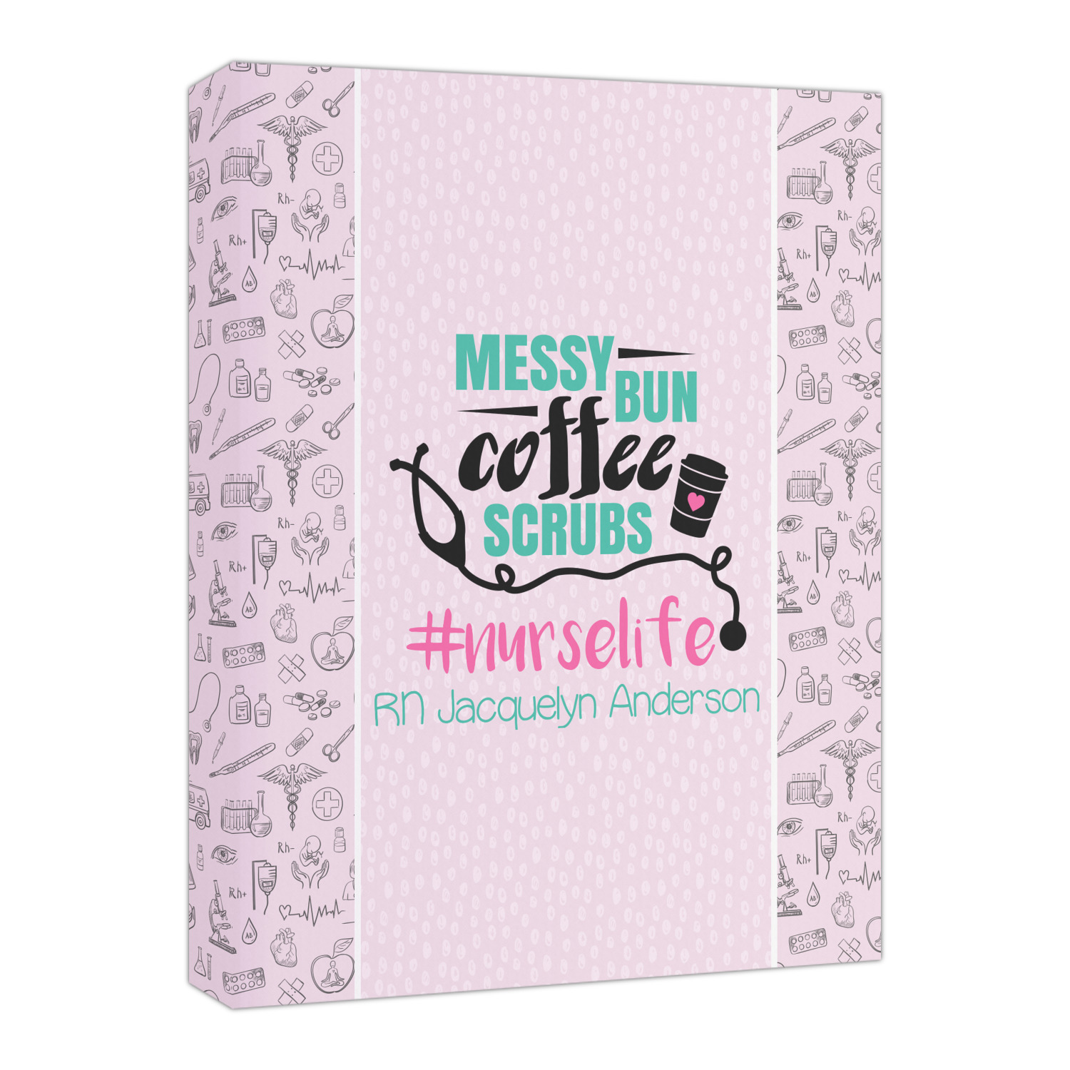 This design features a quote saying "messy bun, coffee, scrubs, #nurselife." The background has two different subtle patterns. One has subtle dots, while the other has fun illustrations of different medical tools and symbols. The two backgrounds are a soft pink. The quote has several different colors including pink, black, and teal.