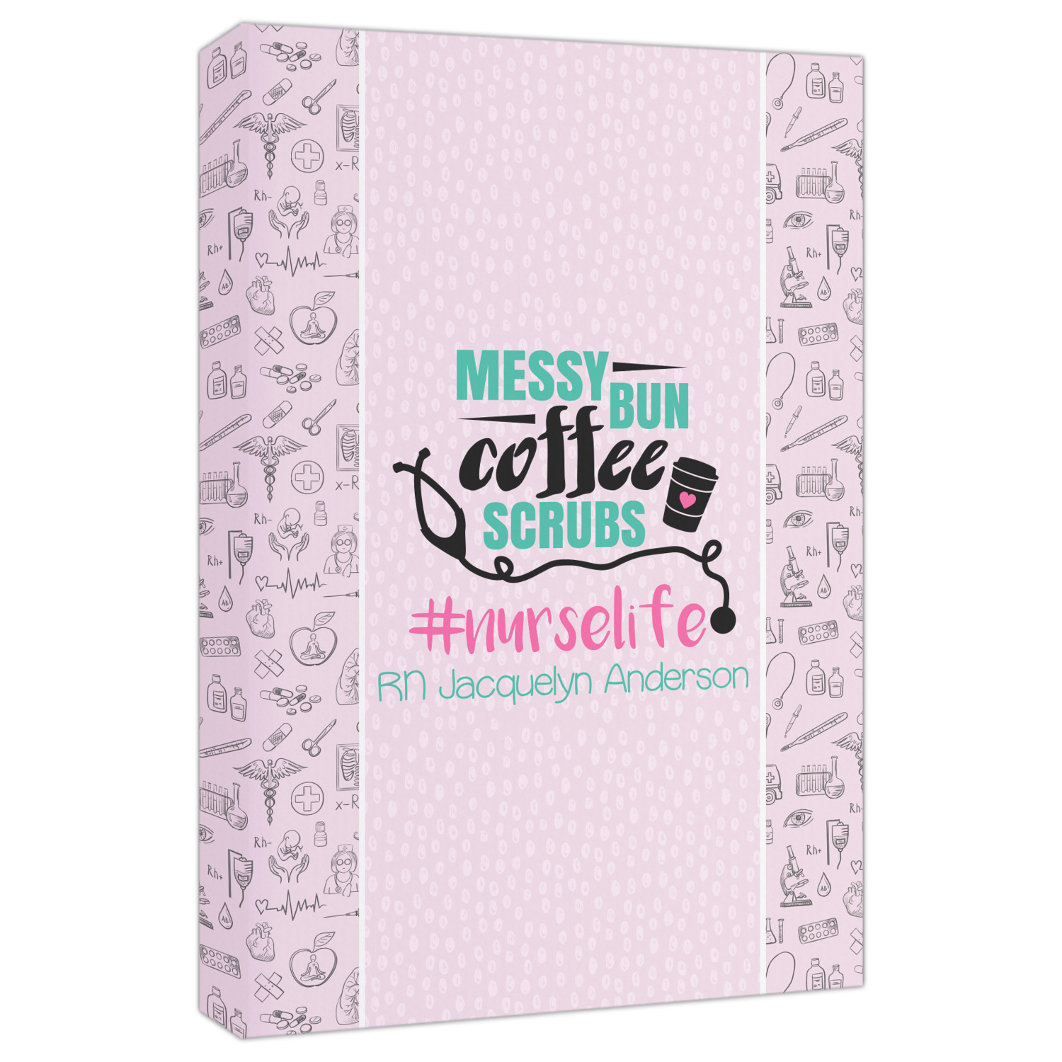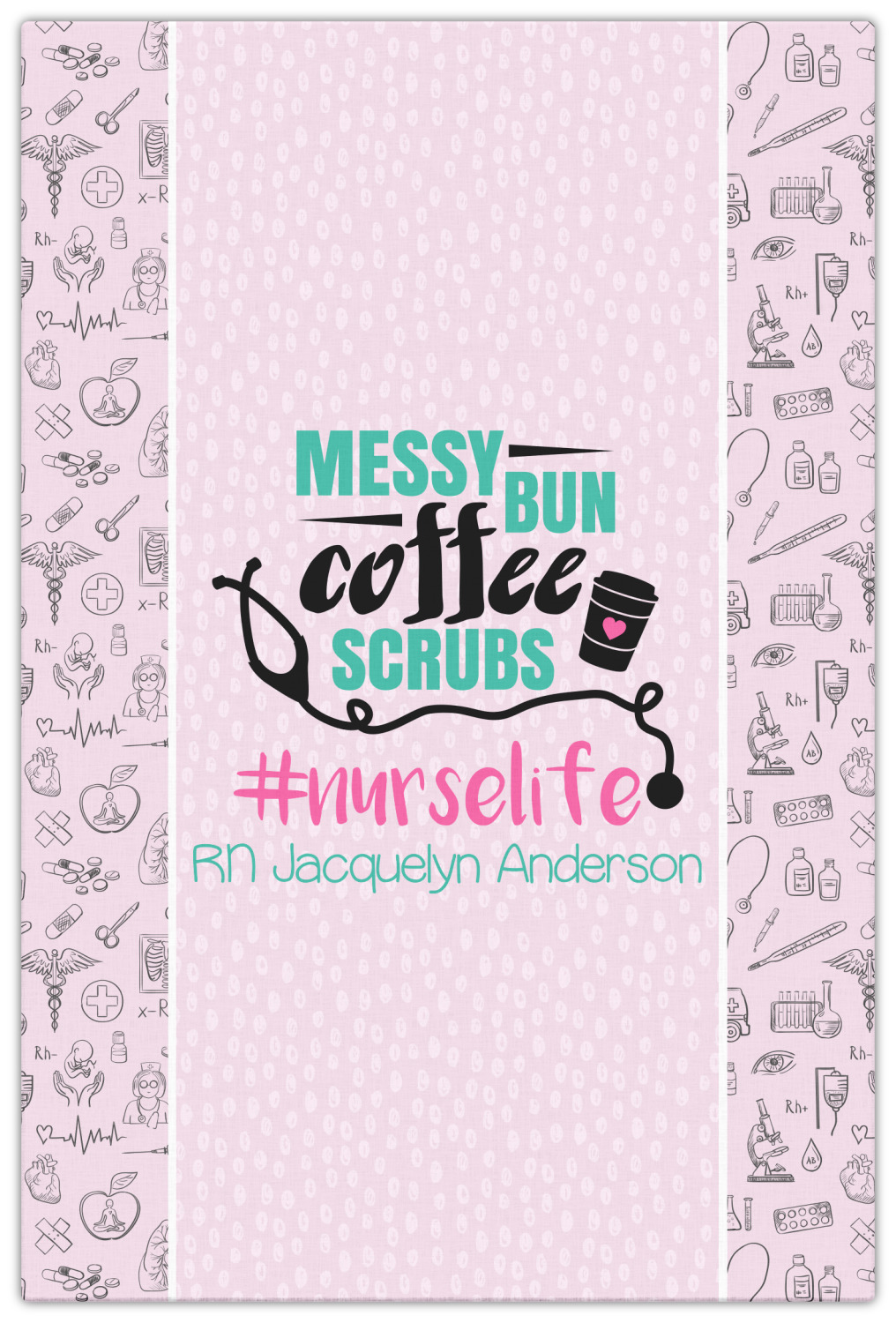 This design features a quote saying "messy bun, coffee, scrubs, #nurselife." The background has two different subtle patterns. One has subtle dots, while the other has fun illustrations of different medical tools and symbols. The two backgrounds are a soft pink. The quote has several different colors including pink, black, and teal.