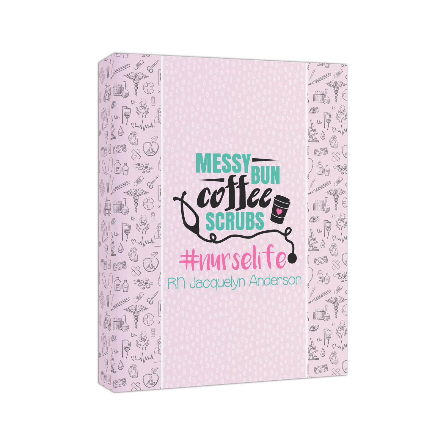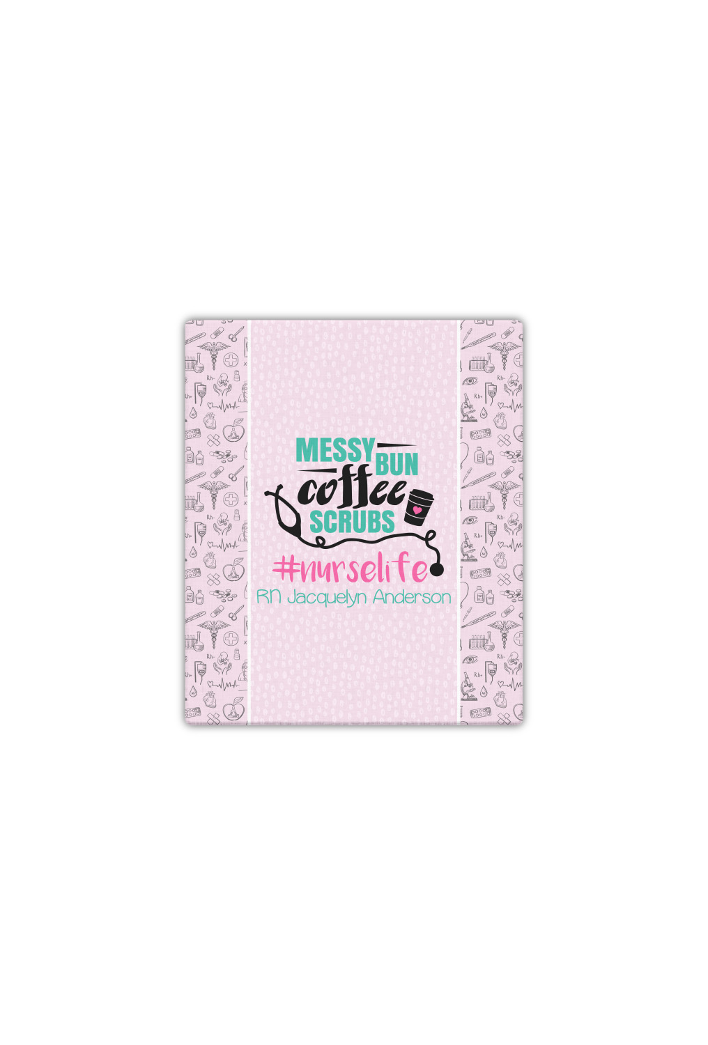 This design features a quote saying "messy bun, coffee, scrubs, #nurselife." The background has two different subtle patterns. One has subtle dots, while the other has fun illustrations of different medical tools and symbols. The two backgrounds are a soft pink. The quote has several different colors including pink, black, and teal.