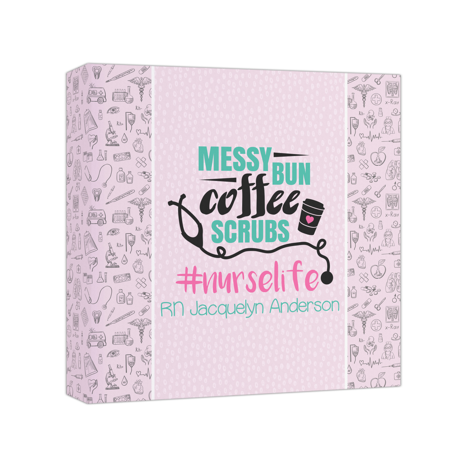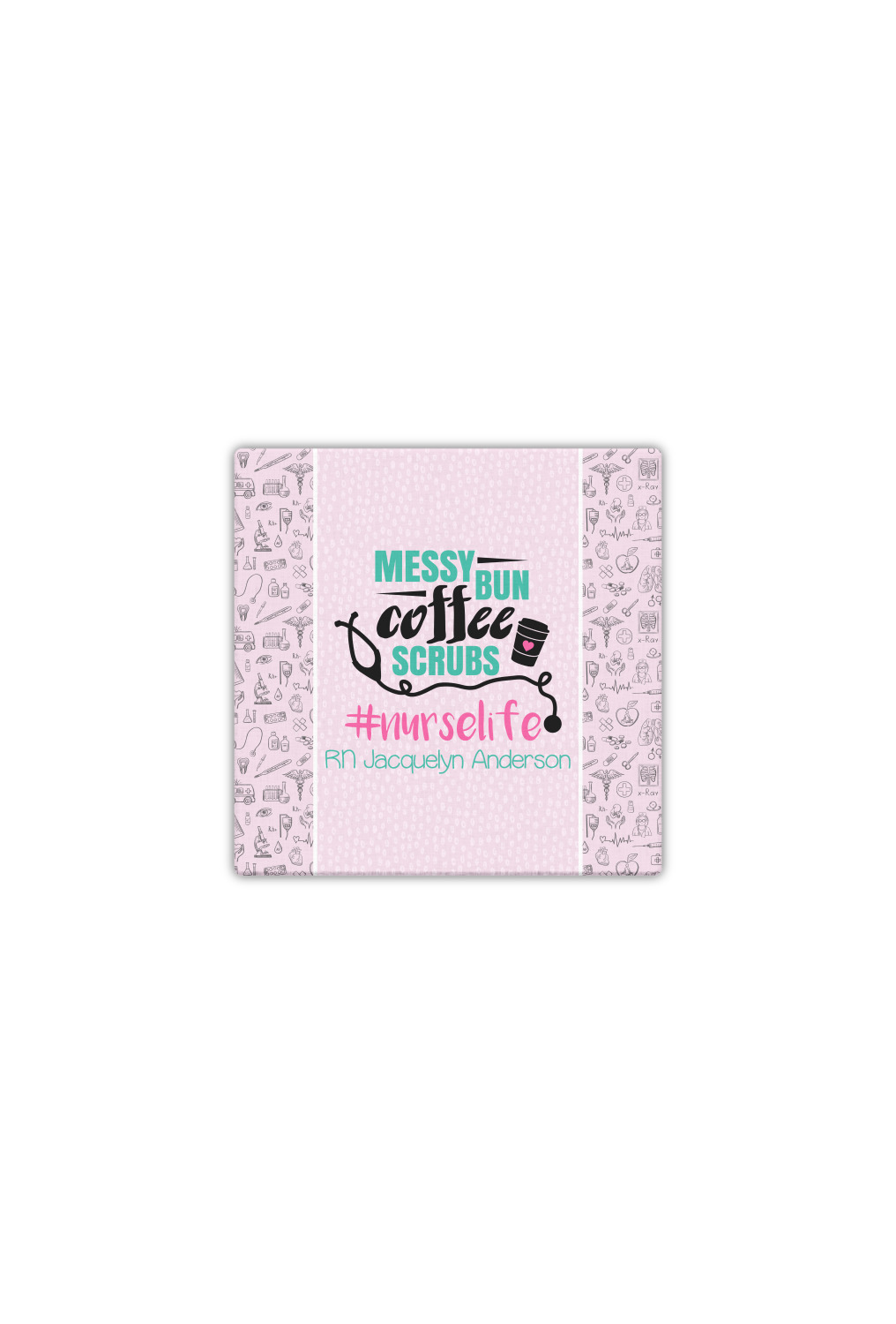 This design features a quote saying "messy bun, coffee, scrubs, #nurselife." The background has two different subtle patterns. One has subtle dots, while the other has fun illustrations of different medical tools and symbols. The two backgrounds are a soft pink. The quote has several different colors including pink, black, and teal.