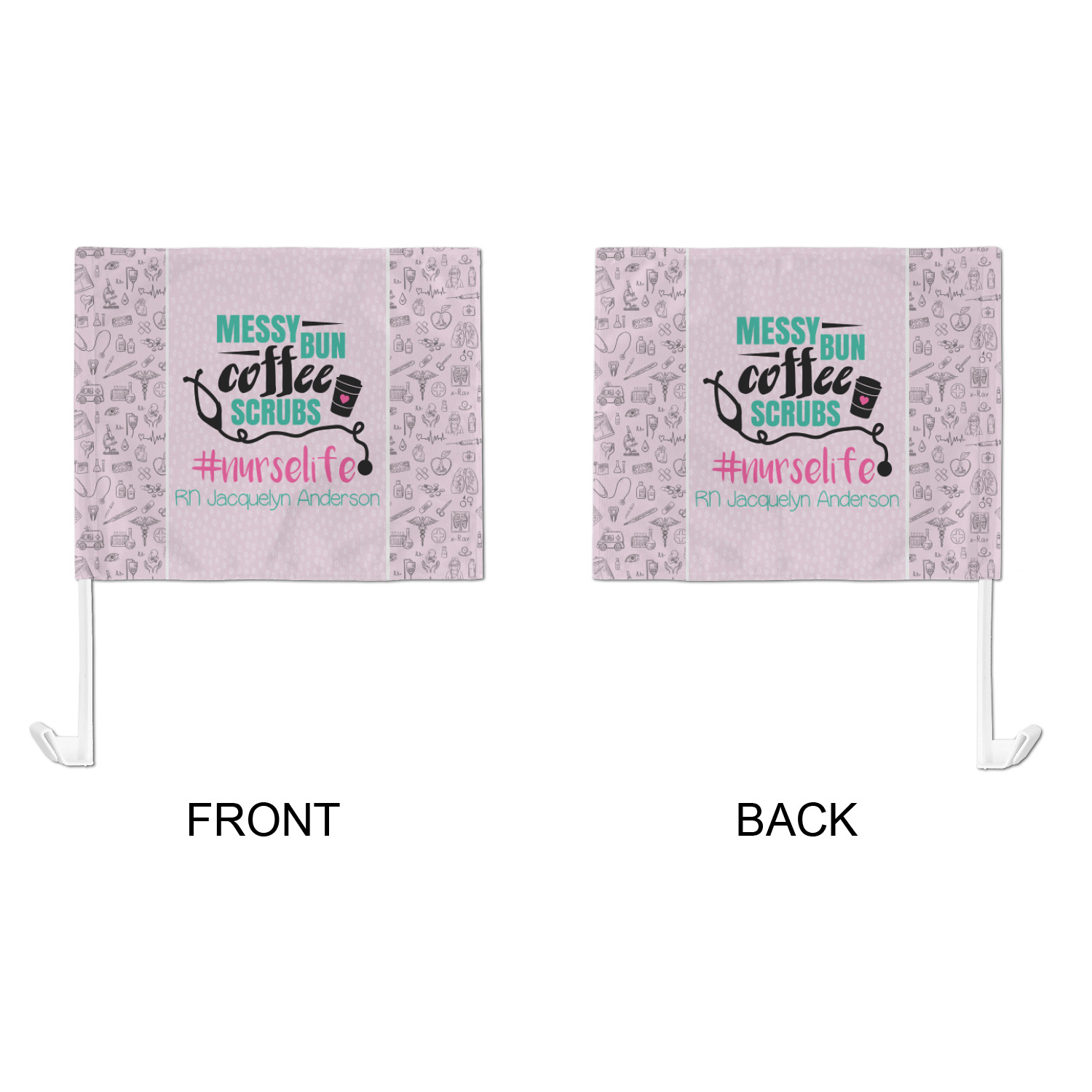 Our personalized flags are made from a durable, yet lightweight cloth that will proudly bear your logo or design of choice, while withstanding the outside elements. We have two size options - 8" x 11" and 11" x 15". Both come with a flag pole which includes a clip that secures the pole to the side window, whether it is rolled up or down. The flags are printed on both sides to display your design from all directions.