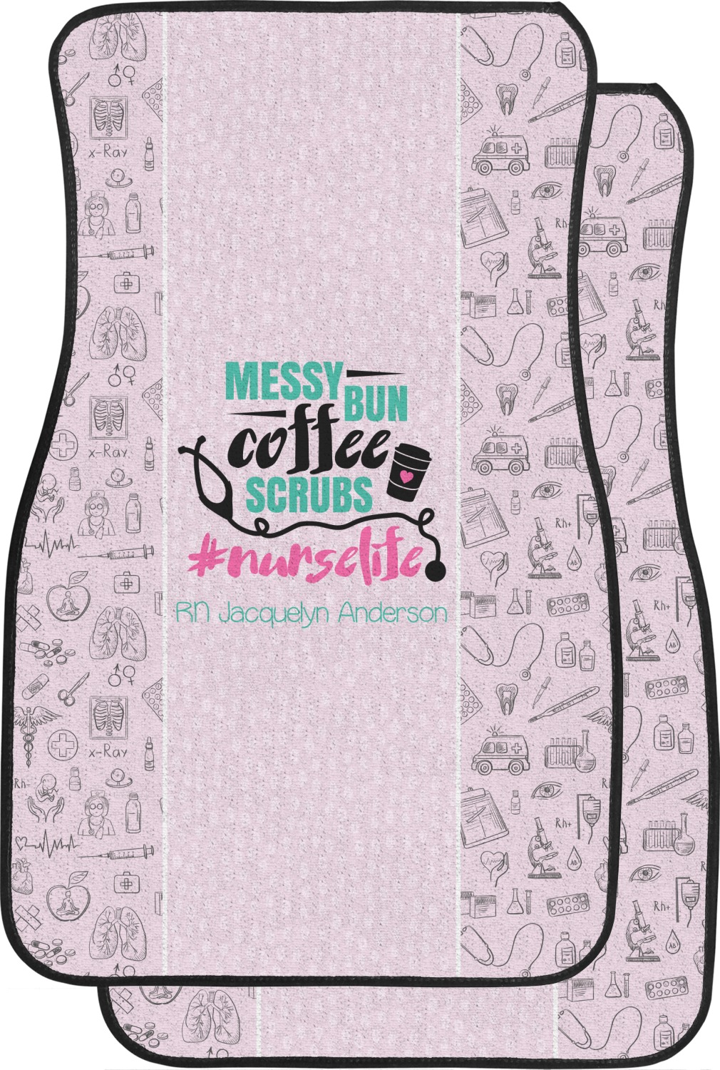 This design features a quote saying "messy bun, coffee, scrubs, #nurselife." The background has two different subtle patterns. One has subtle dots, while the other has fun illustrations of different medical tools and symbols. The two backgrounds are a soft pink. The quote has several different colors including pink, black, and teal.