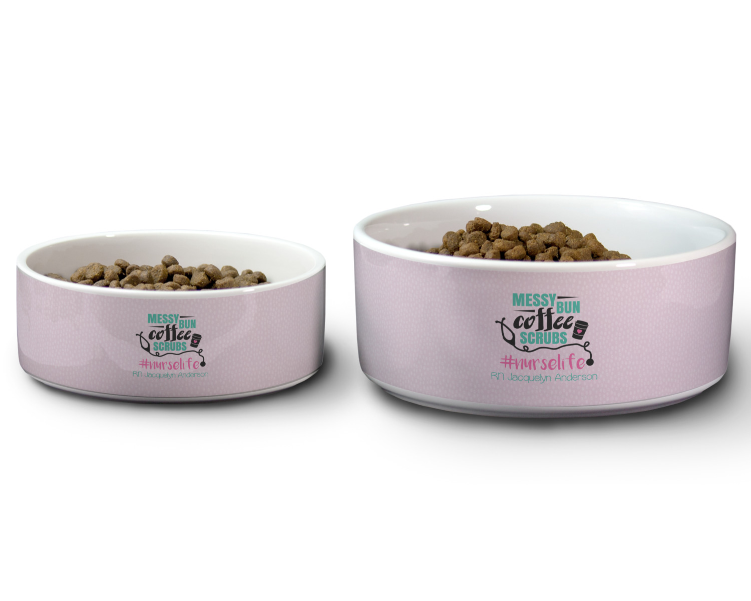 We carry these custom dog bowls in two available sizes: medium and large.The medium is 6 inches in diameter and 2.5 inches tall, and can therefore suit pets who eat up to 2.5 cups of food per meal. The large pet bowl is 7 inches in diameter and 3 inches tall, and suits pets who require up to 4.5 cups of food per meal.