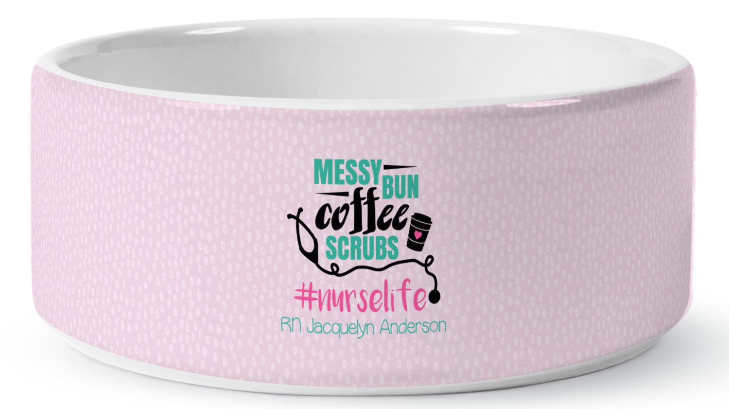 This design features a quote saying "messy bun, coffee, scrubs, #nurselife." The background has two different subtle patterns. One has subtle dots, while the other has fun illustrations of different medical tools and symbols. The two backgrounds are a soft pink. The quote has several different colors including pink, black, and teal.