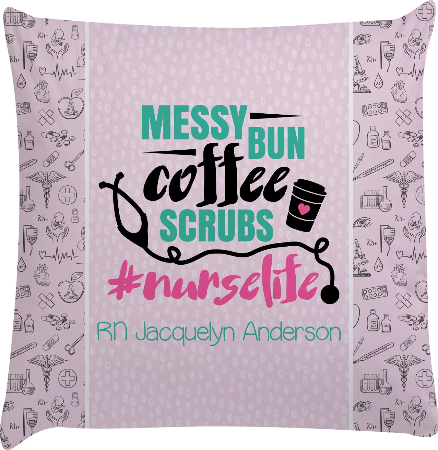 This design features a quote saying "messy bun, coffee, scrubs, #nurselife." The background has two different subtle patterns. One has subtle dots, while the other has fun illustrations of different medical tools and symbols. The two backgrounds are a soft pink. The quote has several different colors including pink, black, and teal.