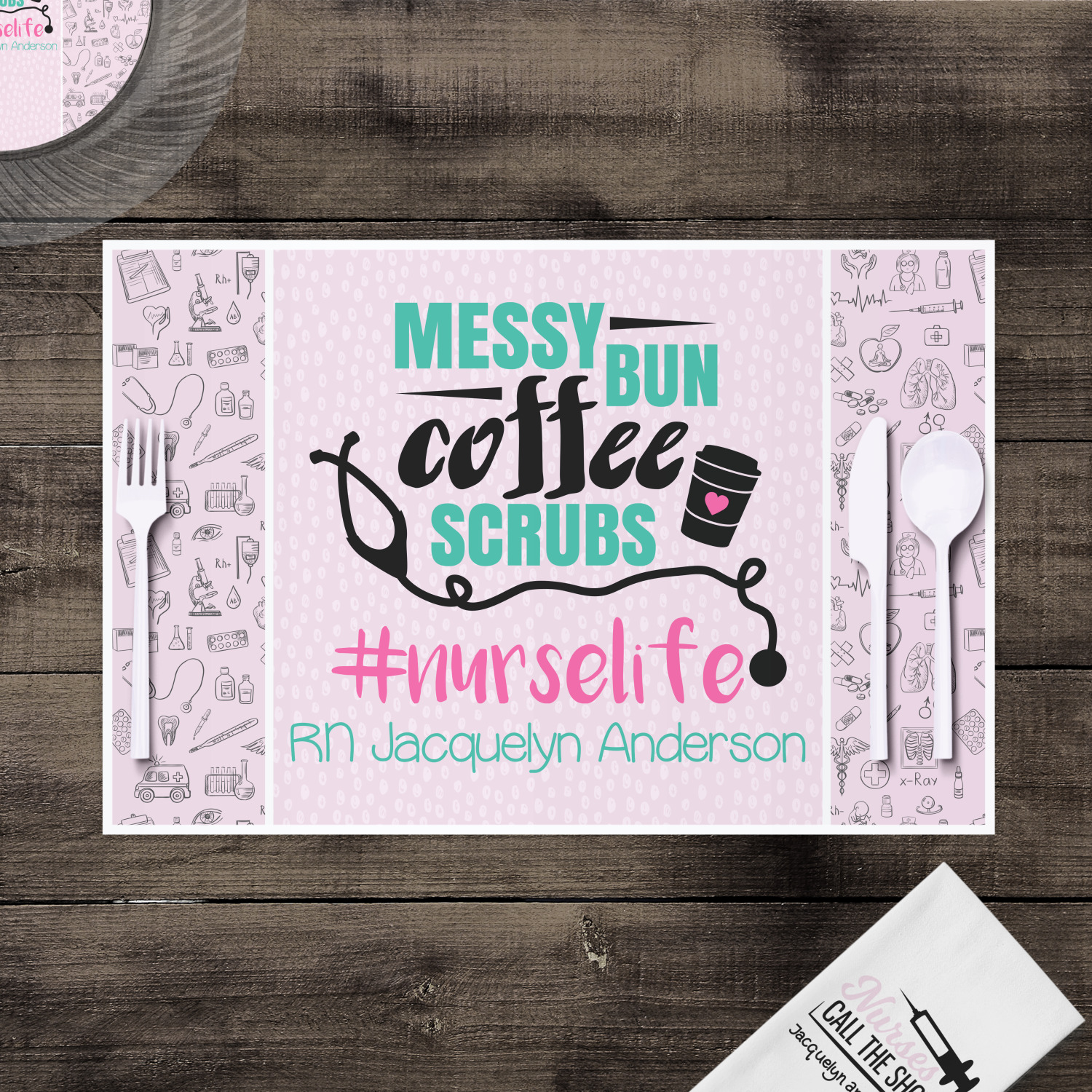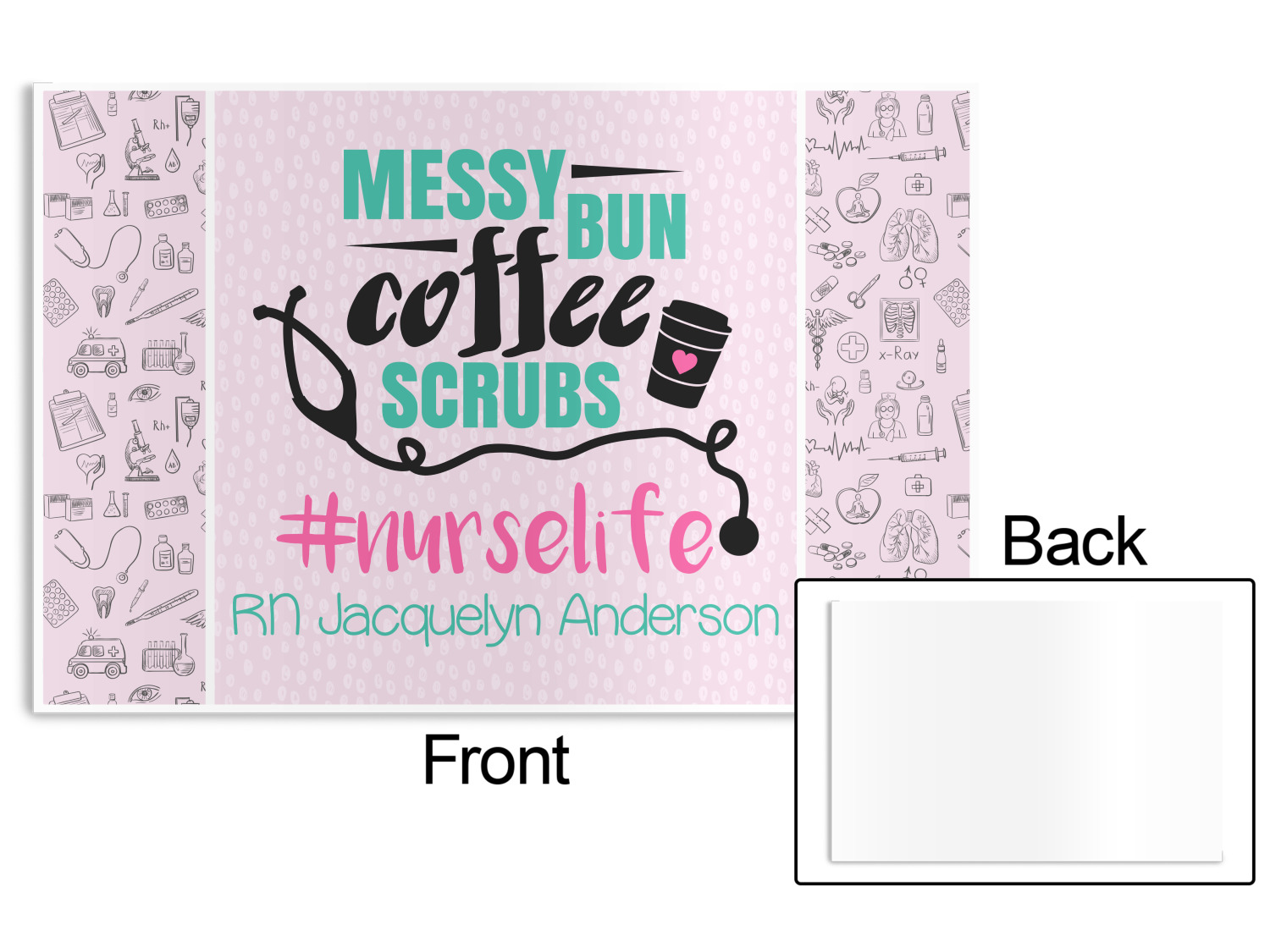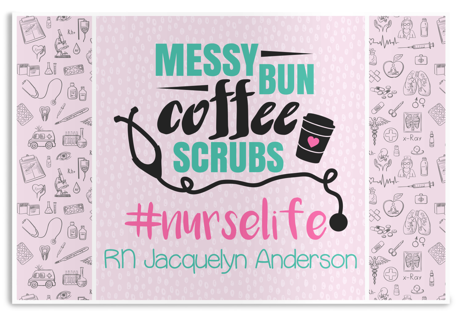 This design features a quote saying "messy bun, coffee, scrubs, #nurselife." The background has two different subtle patterns. One has subtle dots, while the other has fun illustrations of different medical tools and symbols. The two backgrounds are a soft pink. The quote has several different colors including pink, black, and teal.