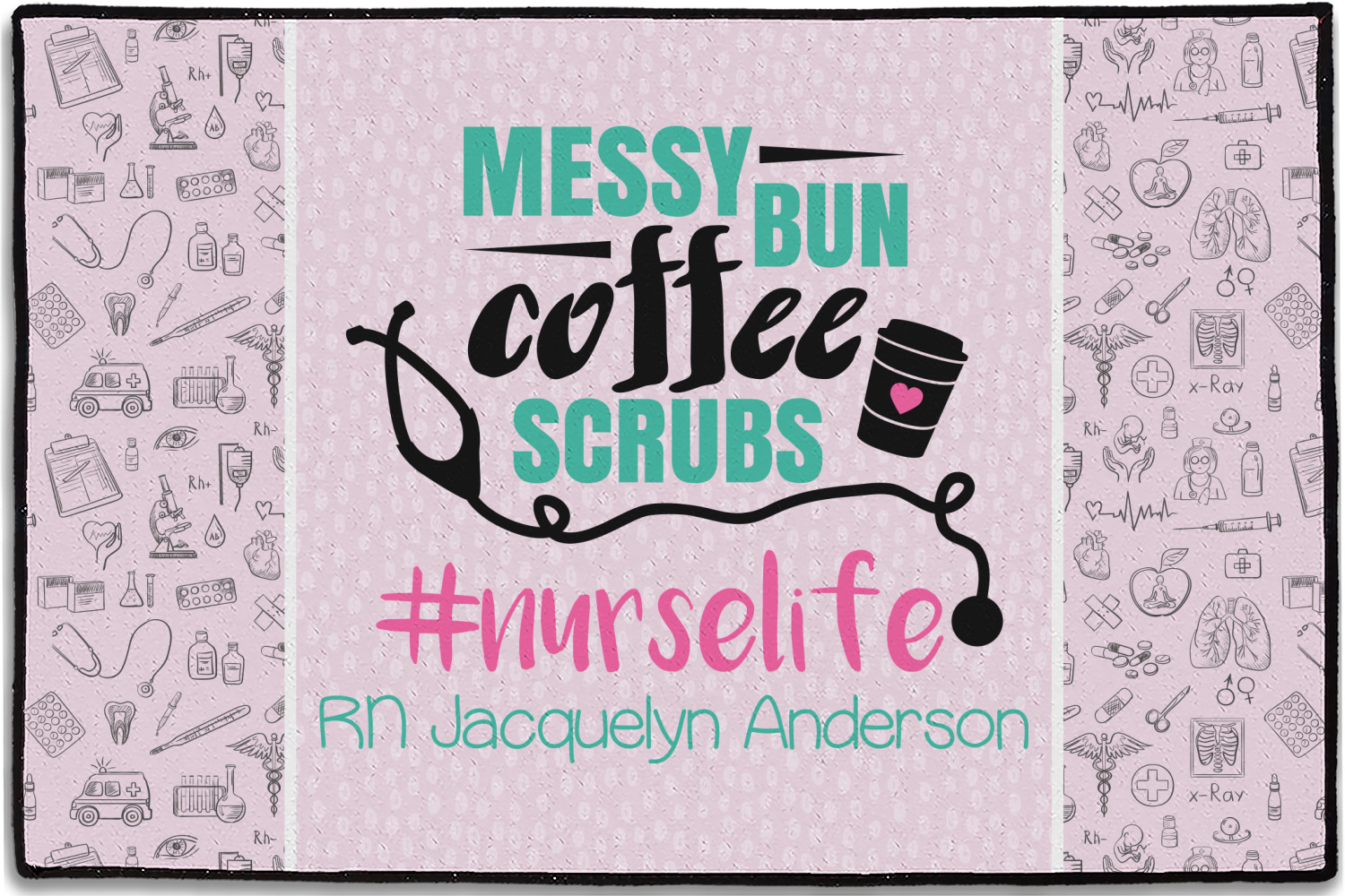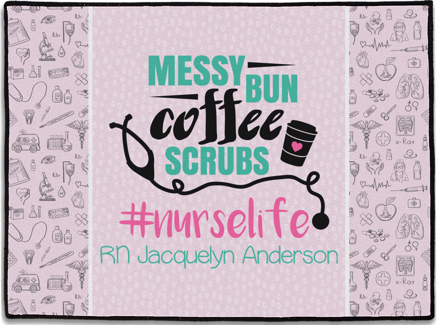 This design features a quote saying "messy bun, coffee, scrubs, #nurselife." The background has two different subtle patterns. One has subtle dots, while the other has fun illustrations of different medical tools and symbols. The two backgrounds are a soft pink. The quote has several different colors including pink, black, and teal.