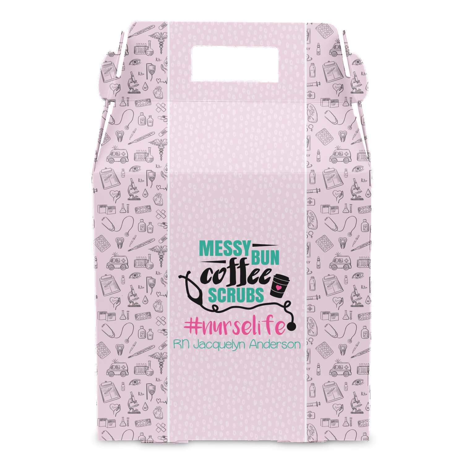 This design features a quote saying "messy bun, coffee, scrubs, #nurselife." The background has two different subtle patterns. One has subtle dots, while the other has fun illustrations of different medical tools and symbols. The two backgrounds are a soft pink. The quote has several different colors including pink, black, and teal.