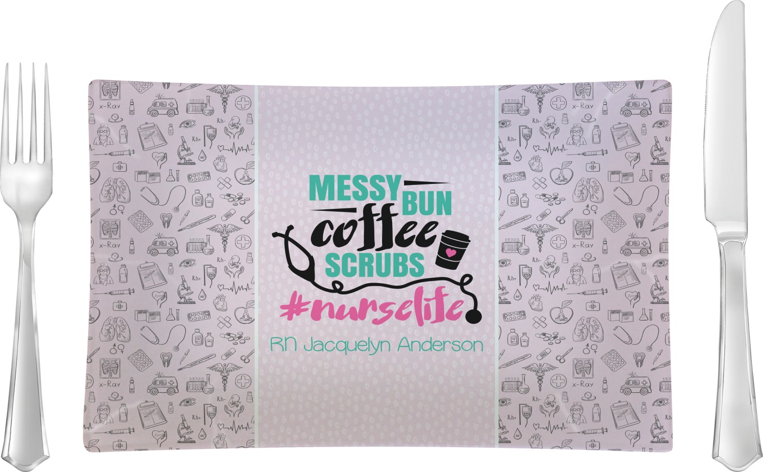 This design features a quote saying "messy bun, coffee, scrubs, #nurselife." The background has two different subtle patterns. One has subtle dots, while the other has fun illustrations of different medical tools and symbols. The two backgrounds are a soft pink. The quote has several different colors including pink, black, and teal.