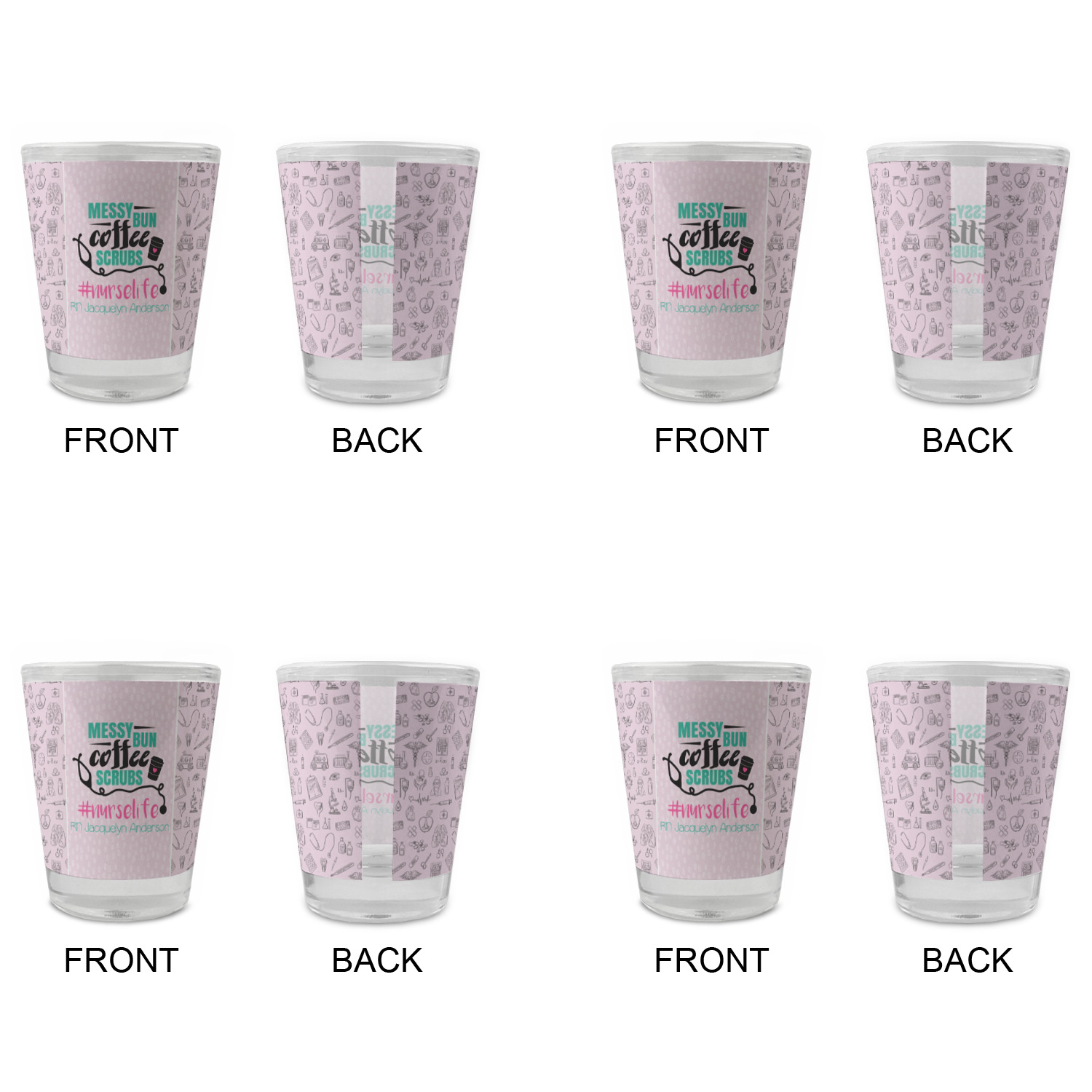This design features a quote saying "messy bun, coffee, scrubs, #nurselife." The background has two different subtle patterns. One has subtle dots, while the other has fun illustrations of different medical tools and symbols. The two backgrounds are a soft pink. The quote has several different colors including pink, black, and teal.