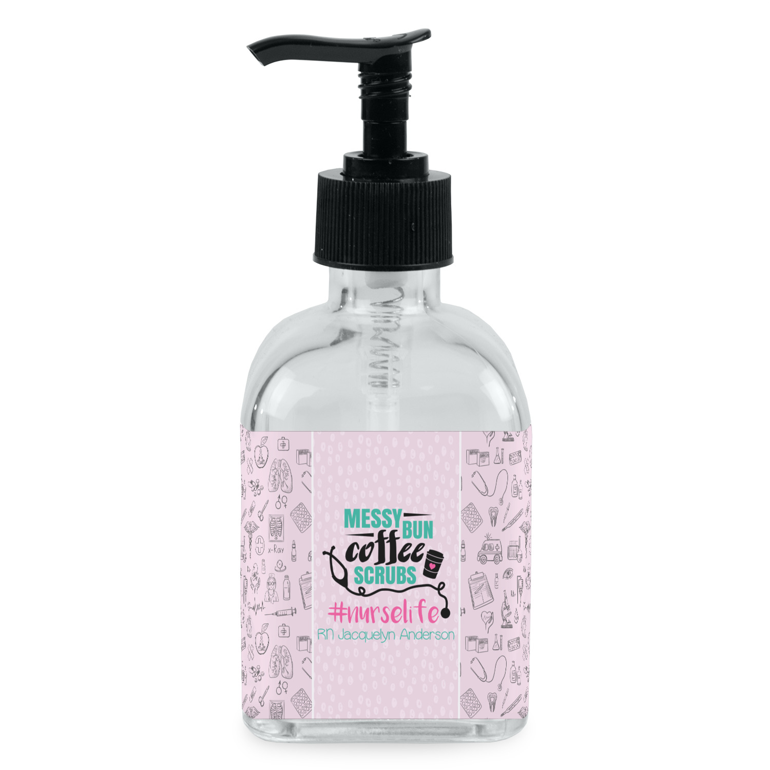 Crafted from a high-quality glass, these soap dispensers and lotion dispensers are durable and robust, while still looking elegant. They are sold with black pumps. Each soap dispenser pump measures at 6.5 by 2.25 inches. On these soap pumps, we display your customized design on a personalized vinyl adhesive on three sides. That way, you can judge how much liquid is in the bottles from the back.