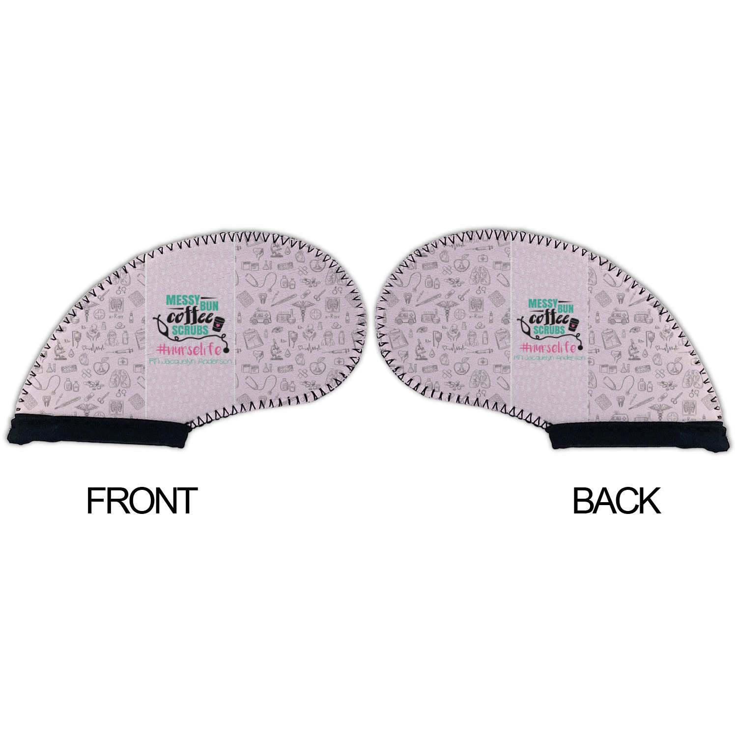 This design features a quote saying "messy bun, coffee, scrubs, #nurselife." The background has two different subtle patterns. One has subtle dots, while the other has fun illustrations of different medical tools and symbols. The two backgrounds are a soft pink. The quote has several different colors including pink, black, and teal.